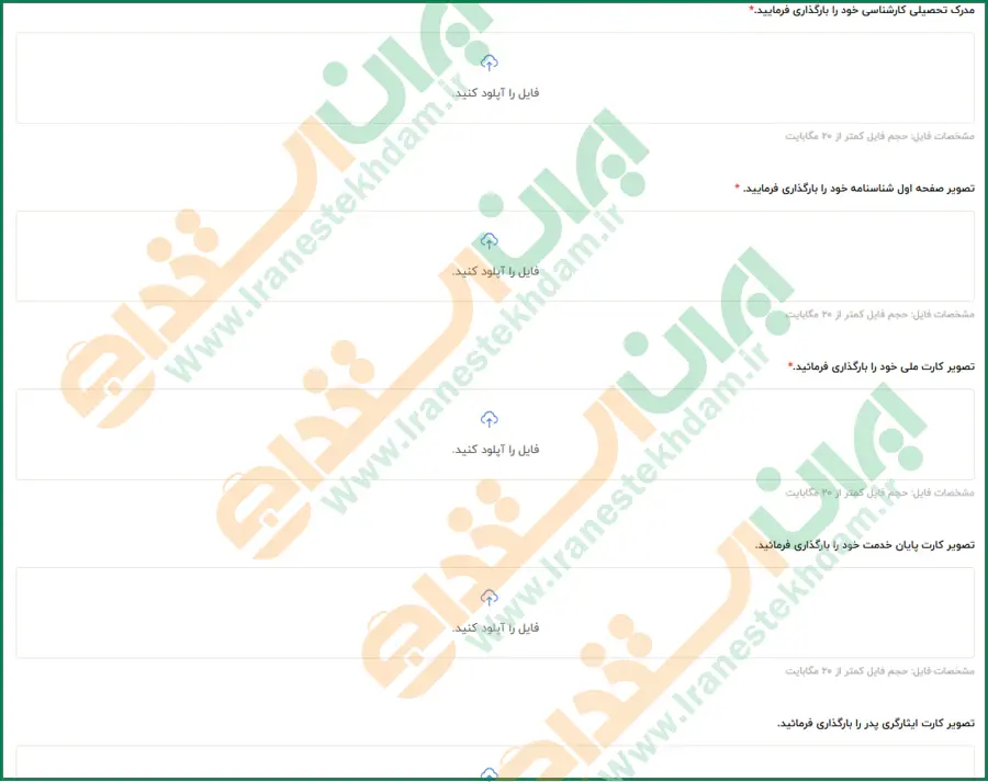 این بخش مربوط به بارگذاری مدارک است که لازم است در آن مدرک تحصیلی کارشناسی، تصویر اول شناسنامه، تصویر کارت و.. را بارگذاری نمایید.