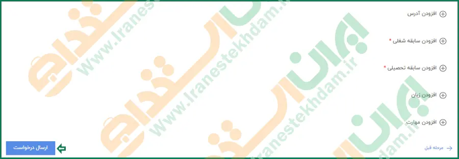 در این بخش لازم است روی گزینه های افزودن آدرس، سابقه شغلی، سابقه تحصیلی و.. کلیک کرده و اطلاعات خواسته شده را وارد کنید، سپس روی دکمه "ارسال درخواست" کلیک نمایید.