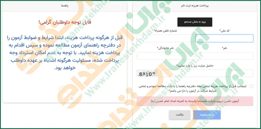 این مرحله مربوط به پرداخت هزینه ثبت نام است که لازم است مبلغ تعیین شده را پرداخت نمایید.