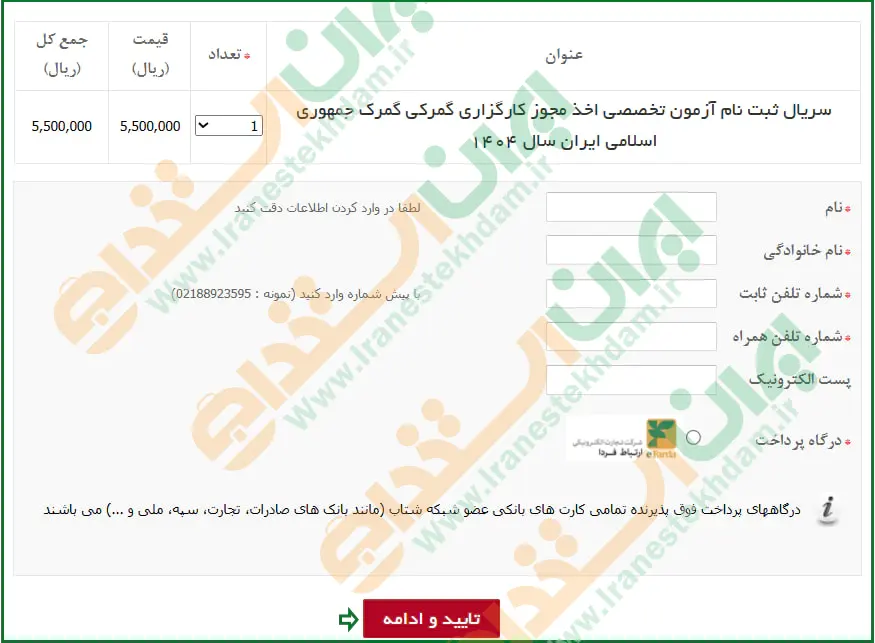 در این مرحله باید اطلاعاتی نظیر نام و نام خانوادگی، شماره تلفن ثابت، شماره تلفن همراه و پست الکترونیک را وارد کنید. سپس درگاه پرداخت را انتخاب کرده و روی دکمه "تأیید و ادامه" کلیک نمایید.
