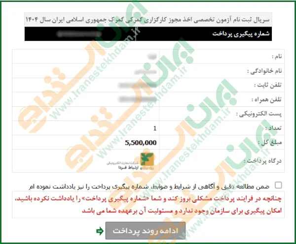 در این قسمت، پیش نمایشی از اطلاعات ثبت شده در مرحله قبل نمایش داده میشود که لازم است شماره پیگیری را یادداشت کرده و سپس روی دکمه "ادامه روند پرداخت" کلیک نمایید.