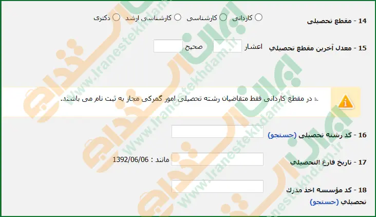 در این قسمت، مقطع تحصیلی خود را انتخاب کرده، سپس آخرین معدل مقطع تحصیلی، کد رشته تحصیلی، تاریخ فارغ التحصیلی و.. را وارد نمایید.