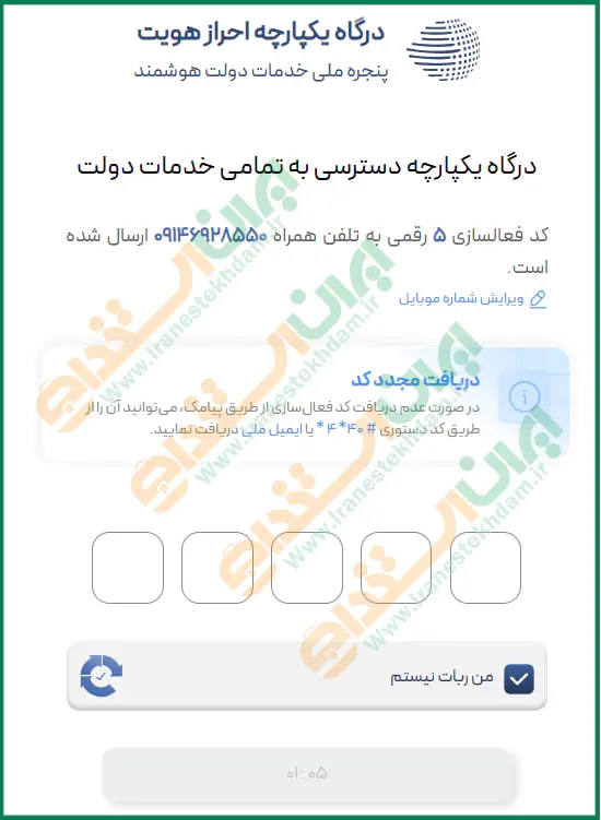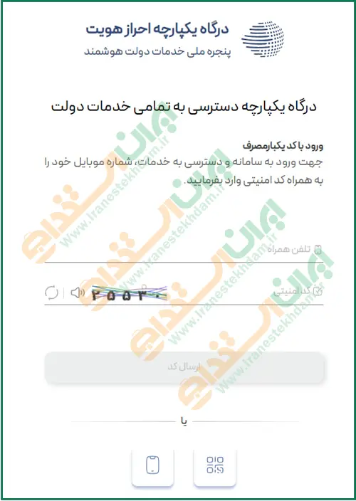 پس از کلیک بر روی گزینه ثبت نام، به صفحه درگاه دولت هدایت میشوید که لارم است شماره تلفن همراه و کد امنیتی را وارد کرده و سپس روی گزینه "ارسال کد" کلیک نمایید.