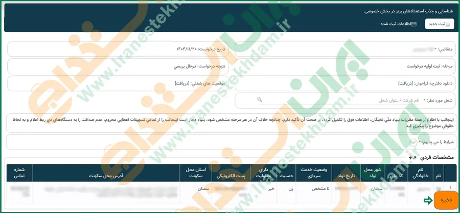 در این مرحله از طریق آیکون ذره بین، شغل یا محل موردنظر را انتخاب نمایید. سپس گزینه پذیرش شرایط را فعال کرده و بر روی دکمه "ذخیره" کلیک کنید. پس از ثبت اطلاعات، در بالای فرم عبارت "درخواست شما با موفقیت ثبت شد" نمایش داده میشود.
