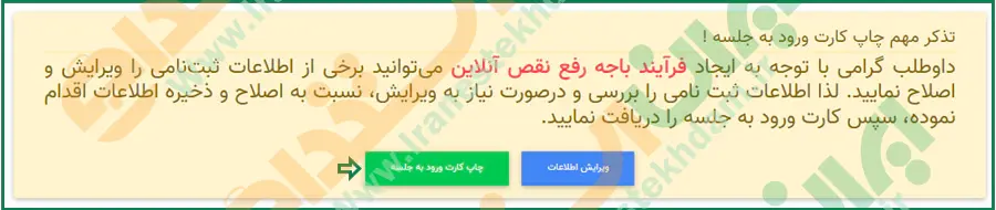 پس از کلیک روی گزینه کارت ورود به جلسه، تذکرات مهم مربوط به کارت ورود به جلسه نمایش داده میشود که در صورت نیاز به ویرایش اطلاعات میتوانید روی گزینه ویرایش کلیک کرده و اطلاعات را اصلاح کنید و در صورت صحیح بودن اطلاعات، روی دکمه "چاپ کارت ورود به جلسه" کلیک نمایید.