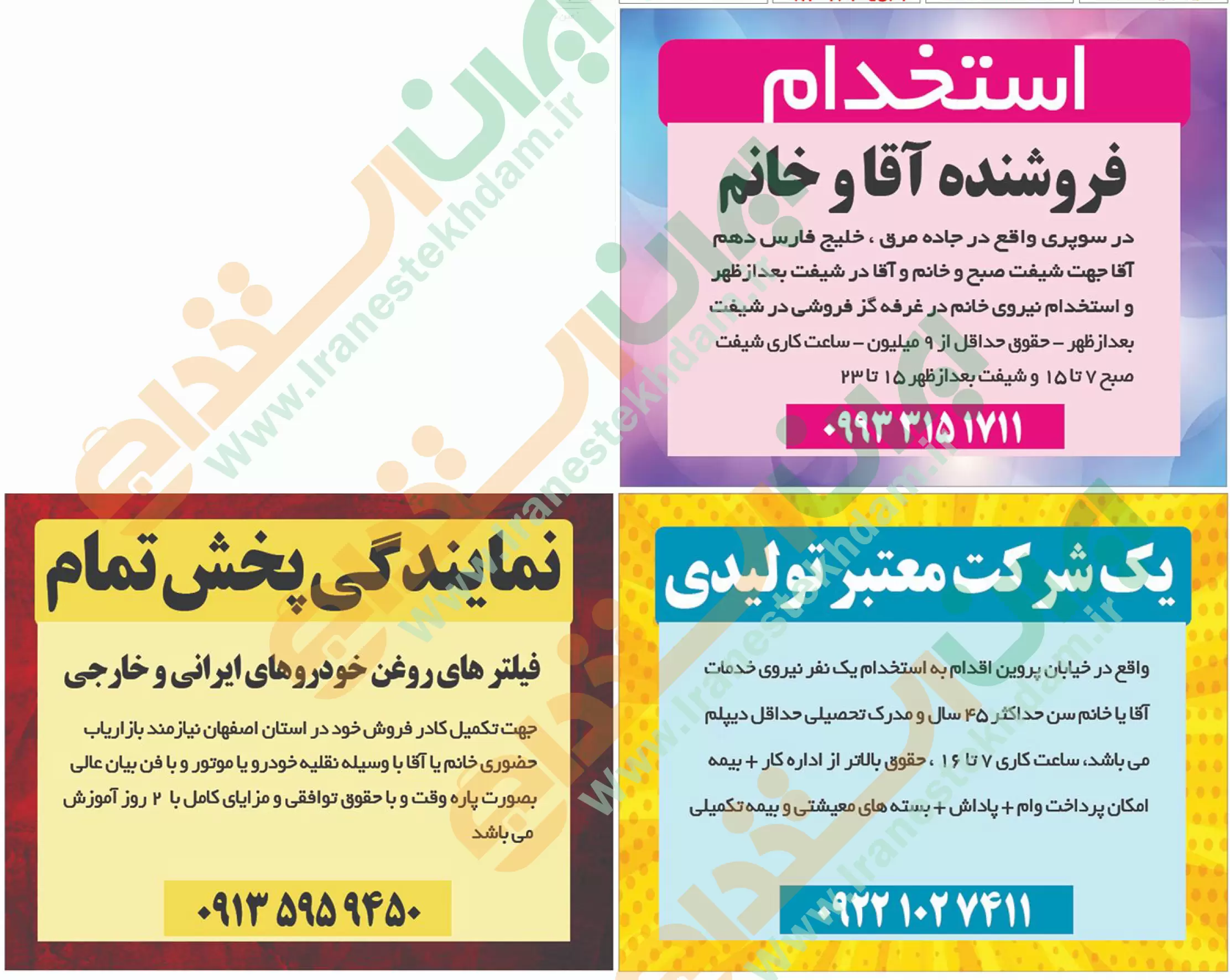 همچنین برای مشاهده صفحه نیازمندی های استخدامی استان اصفهان اینجا کلیک نمایید