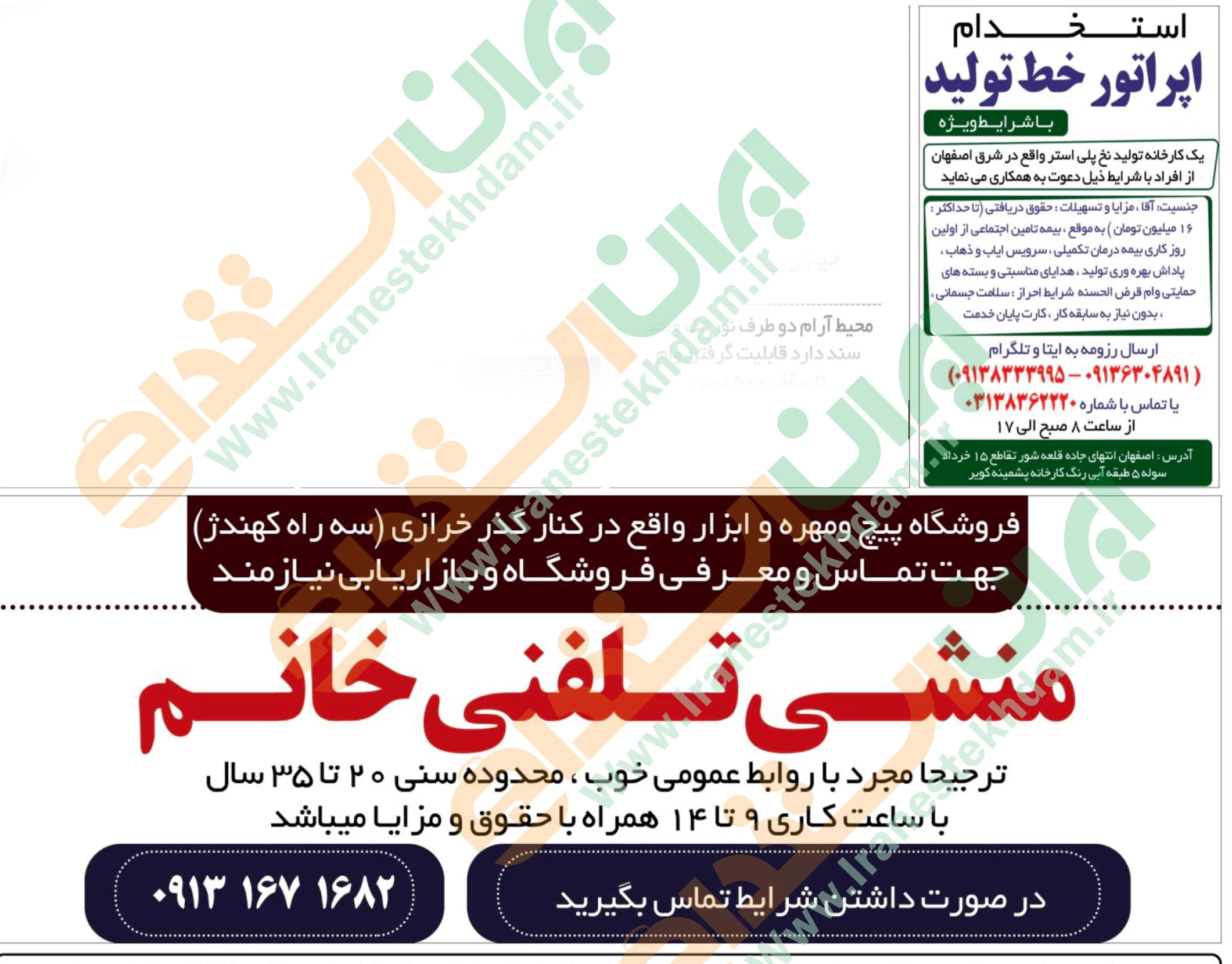 ♦ در صورتی که به دنبال موقعیت های شغلی روز اصفهان هستید، میتوانید از طریق سایت ایران استخدام از یکی از روش های دریافت آگهی های استخدامی “از طریق ایمیل و پیامک – از طریق اپلیکیشن اختصاصی ایران استخدام – از طریق کانال تلگرام ایران استخدام” اقدام نمایید.