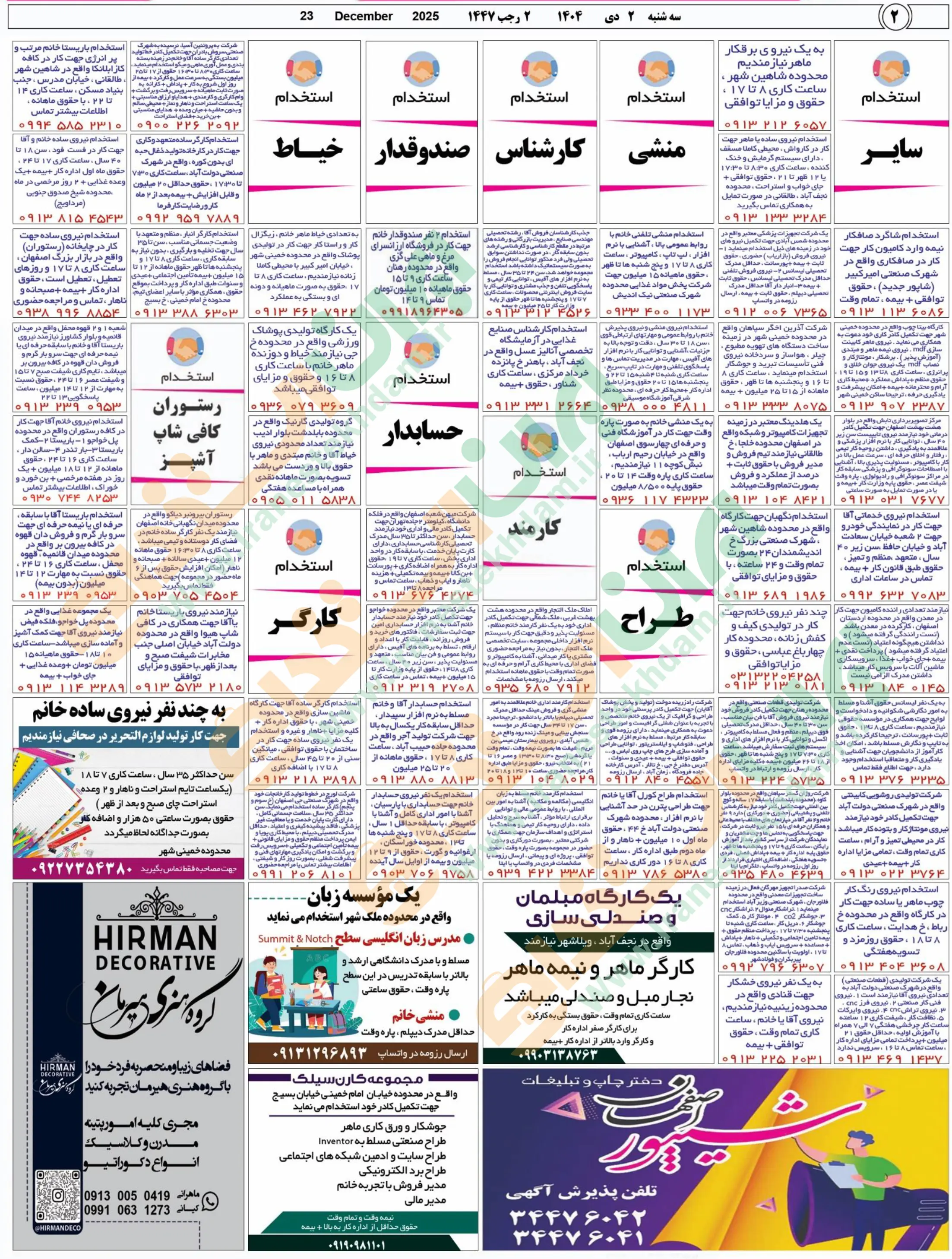 روزنامه استخدامی استان اصفهان | عصر سهشنبه ۲ دی ۱۴۰۴