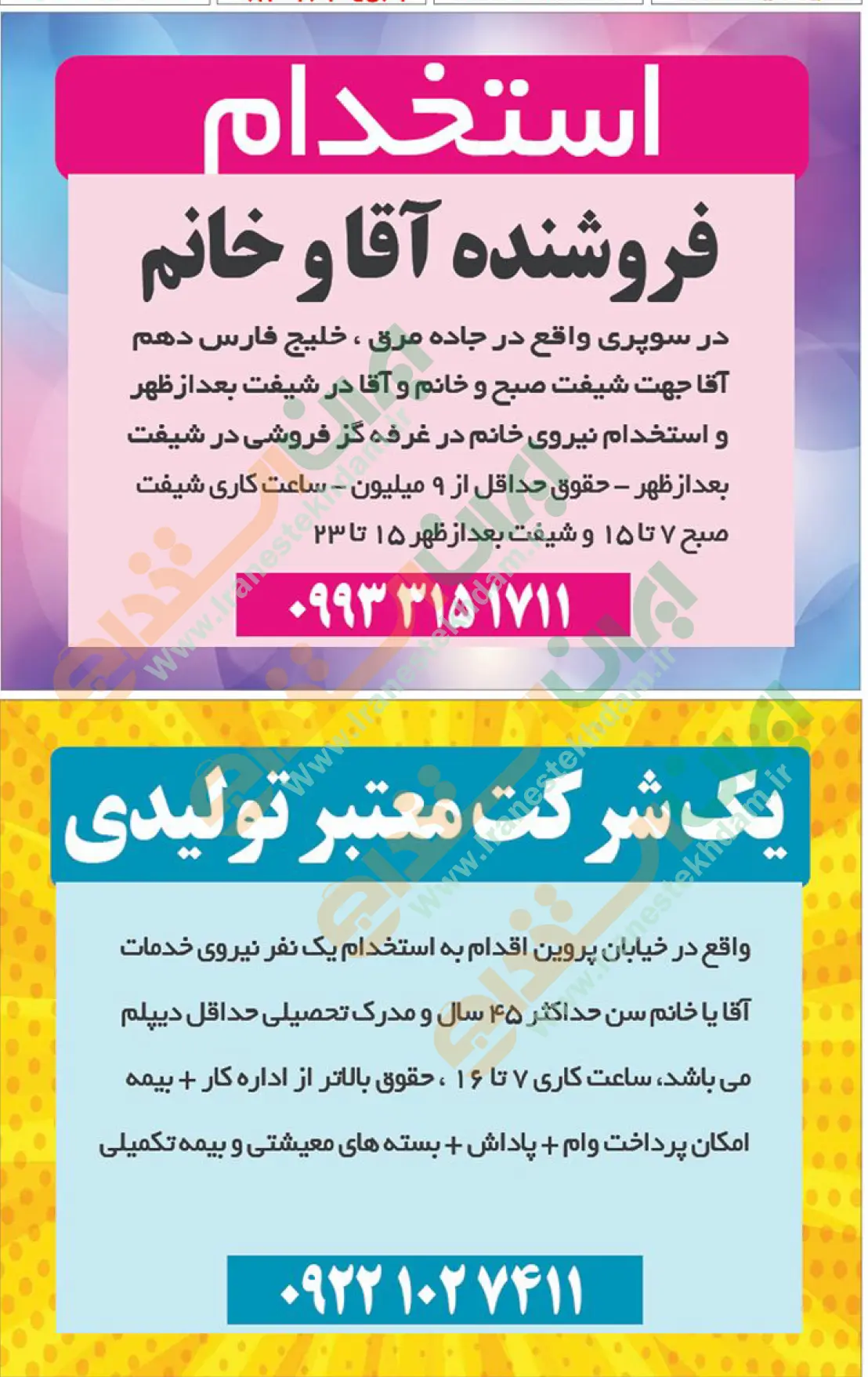 همچنین برای مشاهده صفحه نیازمندی های استخدامی استان اصفهان اینجا کلیک نمایید