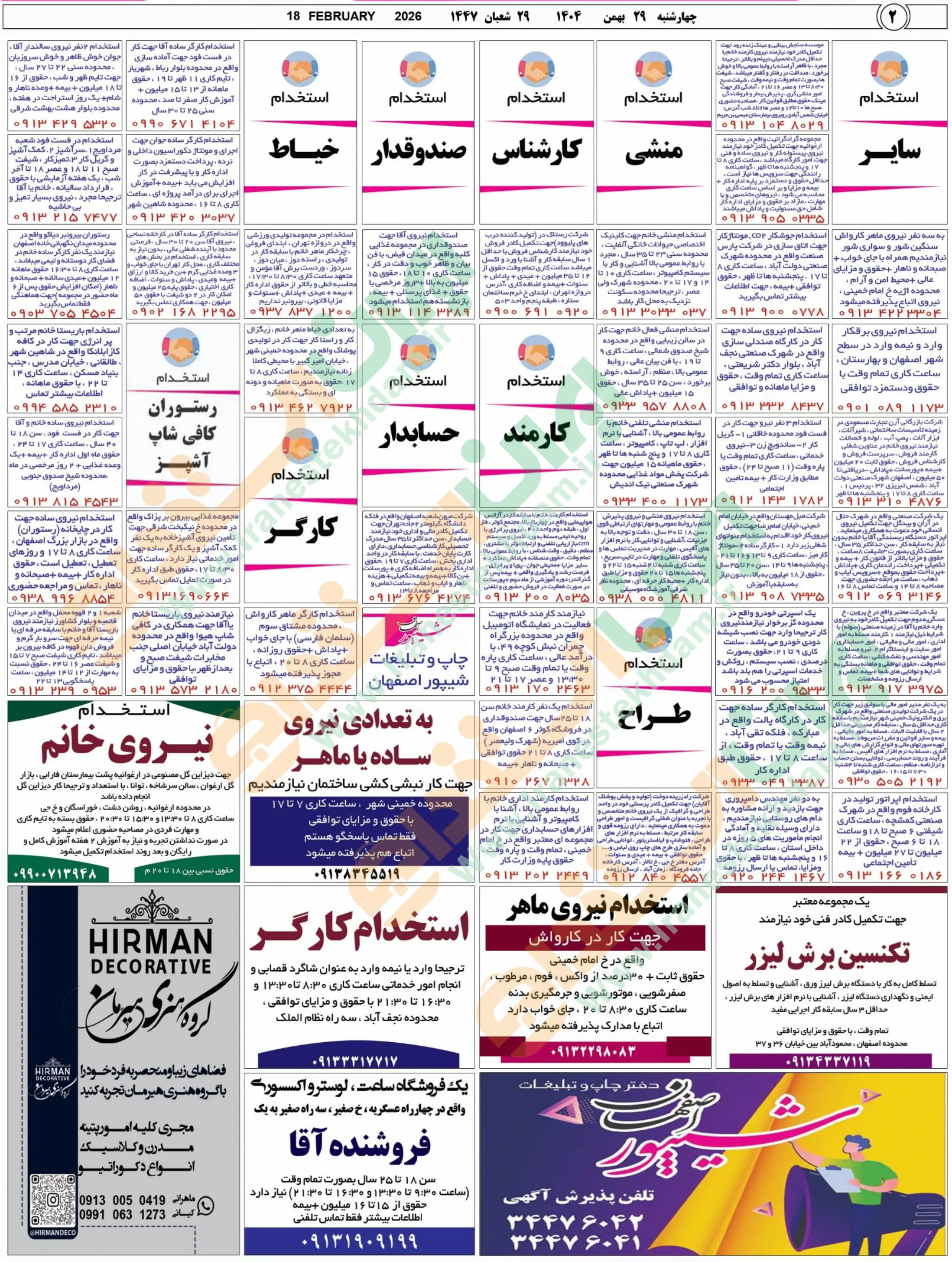 روزنامه استخدامی استان اصفهان | عصر چهارشنبه 29 بهمن 1404