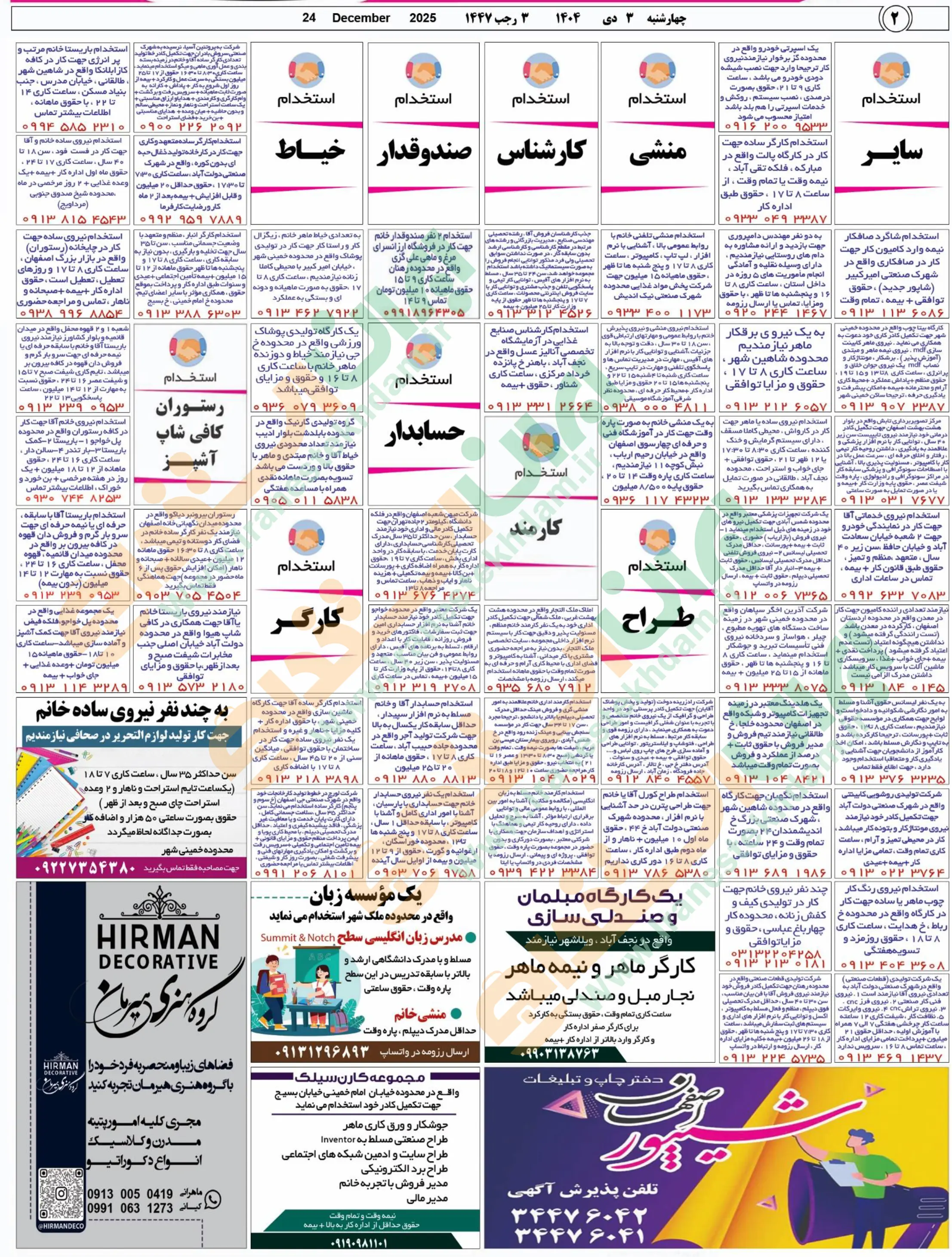 روزنامه استخدامی استان اصفهان | عصر چهارشنبه ۳ دی ۱۴۰۴