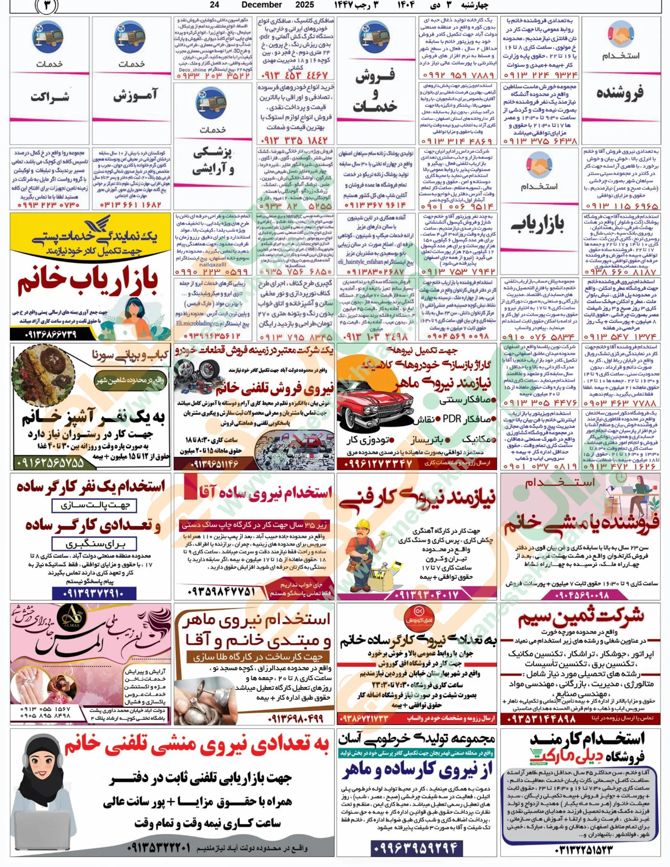 روزنامه استخدامی استان اصفهان | عصر چهارشنبه 3 دی 1404