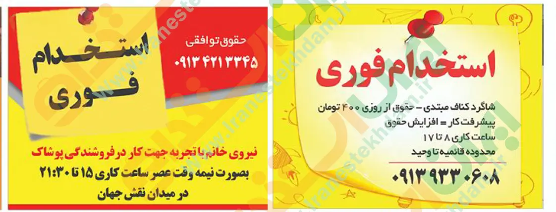 ♦ در صورتی که به دنبال موقعیت های شغلی روز اصفهان هستید، میتوانید از طریق سایت ایران استخدام از یکی از روش های دریافت آگهی های استخدامی “از طریق ایمیل و پیامک – از طریق اپلیکیشن اختصاصی ایران استخدام – از طریق کانال تلگرام ایران استخدام” اقدام نمایید.