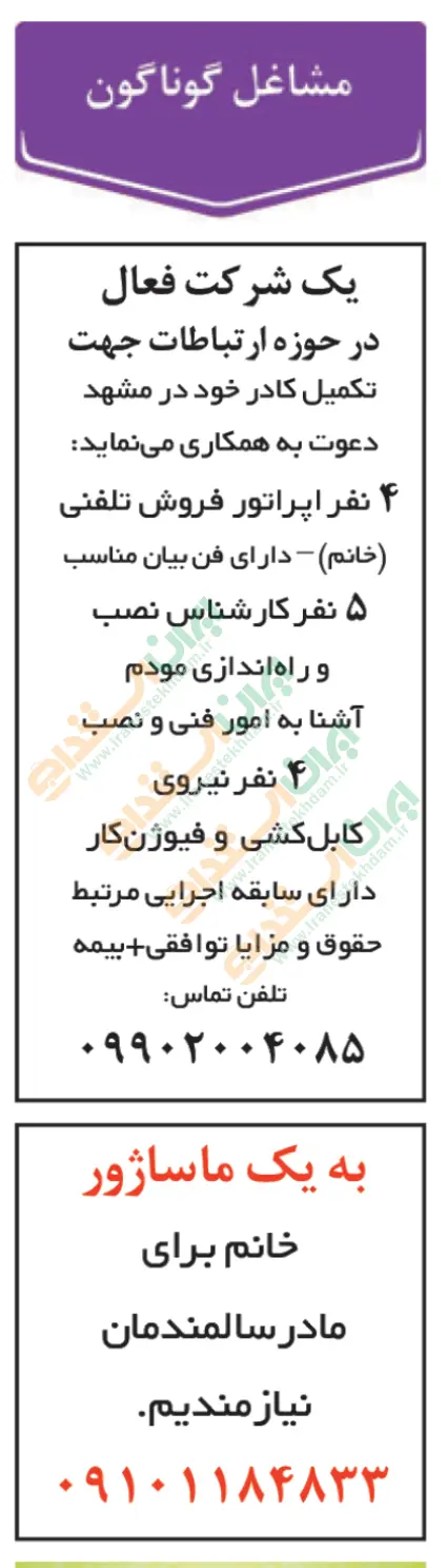 ♦ در صورتی که به دنبال موقعیت های شغلی روز مشهد هستید، میتوانید از طریق سایت ایران استخدام از یکی از روش های دریافت آگهی های استخدامی “از طریق ایمیل و پیامک – از طریق اپلیکیشن اختصاصی ایران استخدام – از طریق کانال تلگرام ایران استخدام” اقدام نمایید.