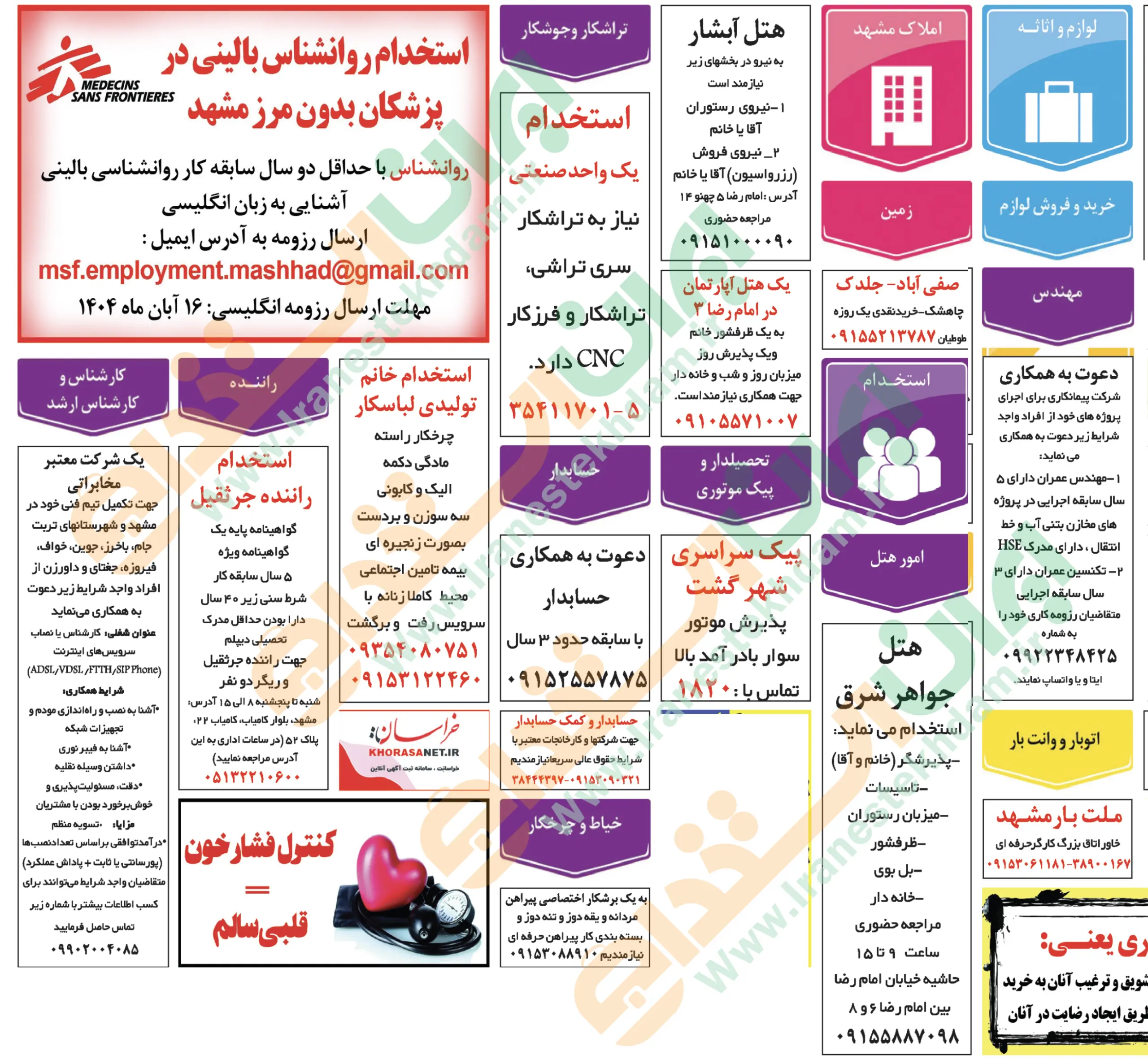 روزنامه استخدامی استان خراسان رضوی و شهر مشهد | شنبه ۱۰ آبان ۱۴۰۴