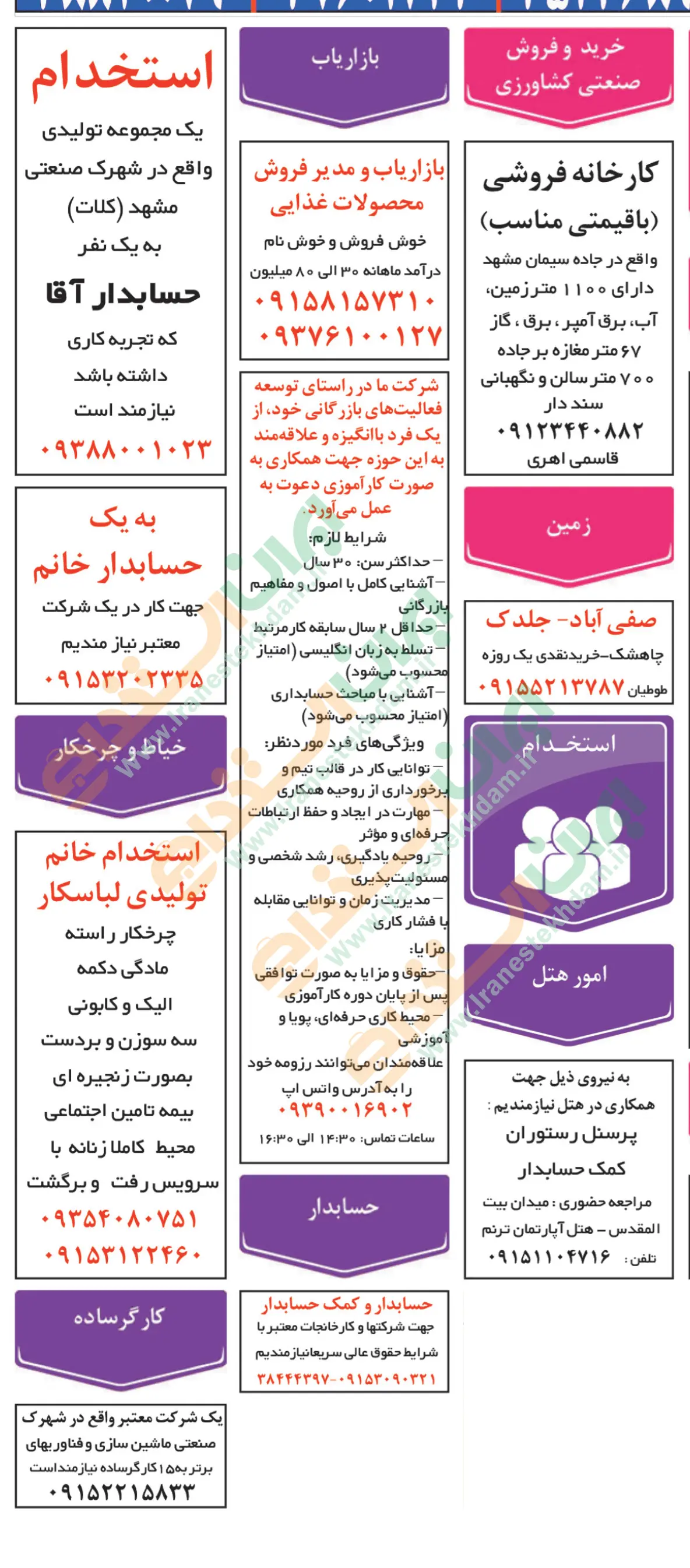 ♦ در صورتی که به دنبال موقعیت های شغلی روز مشهد هستید، میتوانید از طریق سایت ایران استخدام از یکی از روش های دریافت آگهی های استخدامی “از طریق ایمیل و پیامک – از طریق اپلیکیشن اختصاصی ایران استخدام – از طریق کانال تلگرام ایران استخدام” اقدام نمایید.