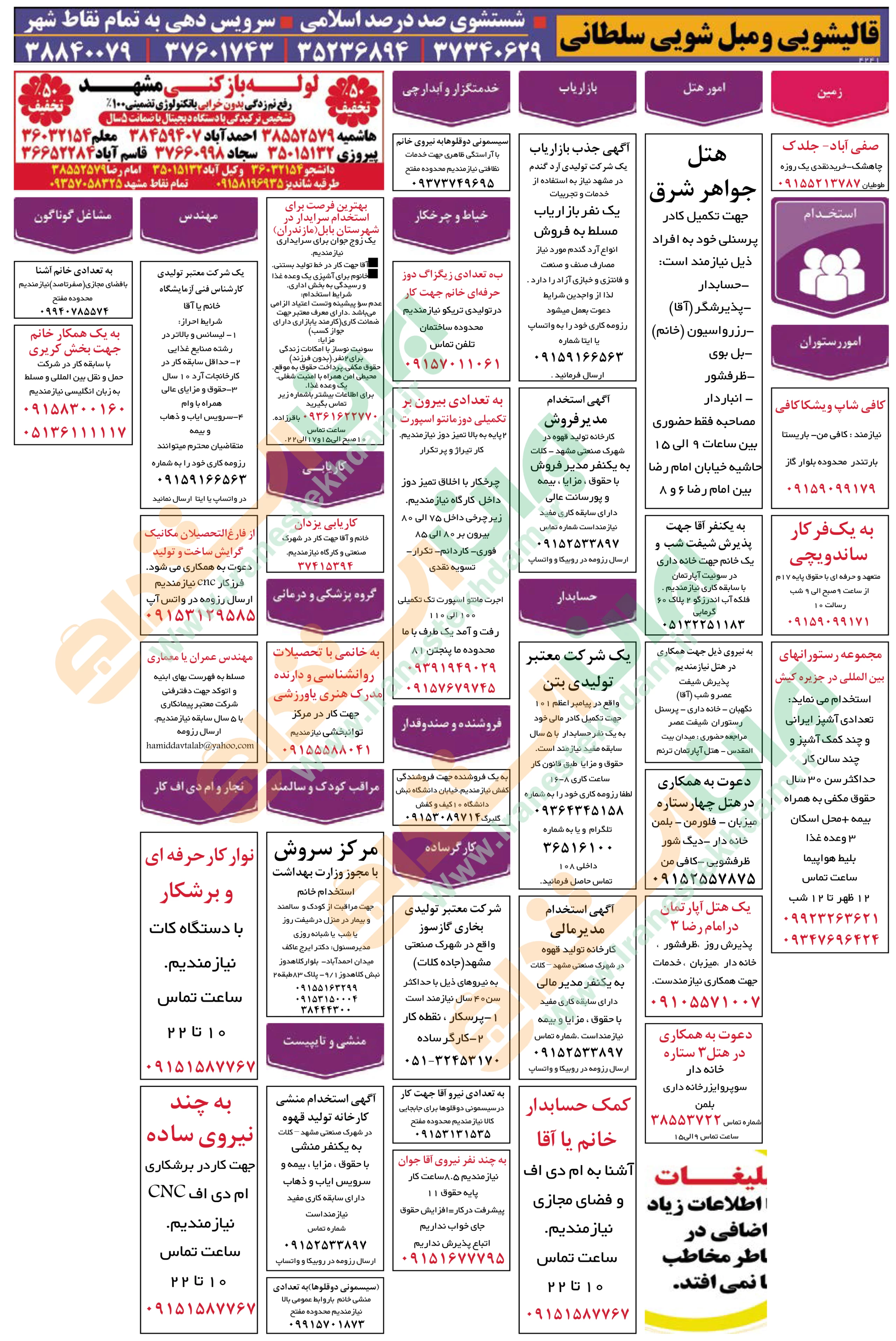 روزنامه استخدامی استان خراسان رضوی و شهر مشهد | شنبه 10 خرداد 1404
