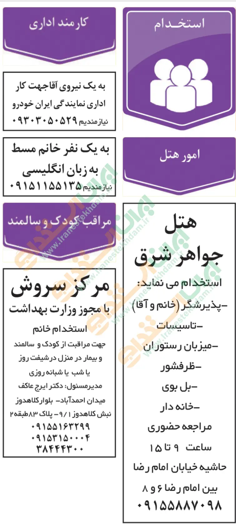 ♦ در صورتی که به دنبال موقعیت های شغلی روز مشهد هستید، میتوانید از طریق سایت ایران استخدام از یکی از روش های دریافت آگهی های استخدامی “از طریق ایمیل و پیامک – از طریق اپلیکیشن اختصاصی ایران استخدام – از طریق کانال تلگرام ایران استخدام” اقدام نمایید.