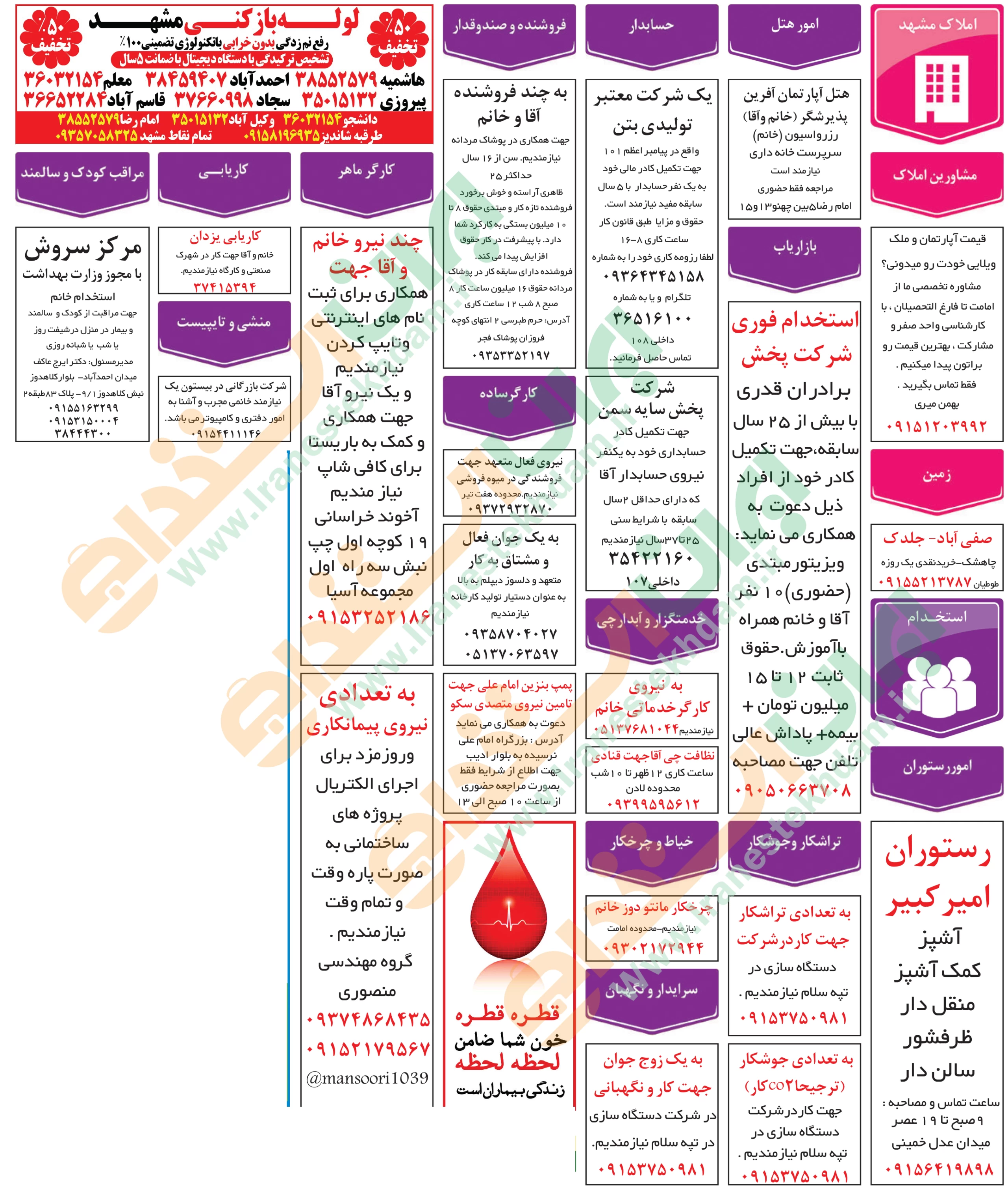 ♦ در صورتی که به دنبال موقعیت های شغلی روز مشهد هستید، میتوانید از طریق سایت ایران استخدام از یکی از روش های دریافت آگهی های استخدامی “از طریق ایمیل و پیامک – از طریق اپلیکیشن اختصاصی ایران استخدام – از طریق کانال تلگرام ایران استخدام” اقدام نمایید.