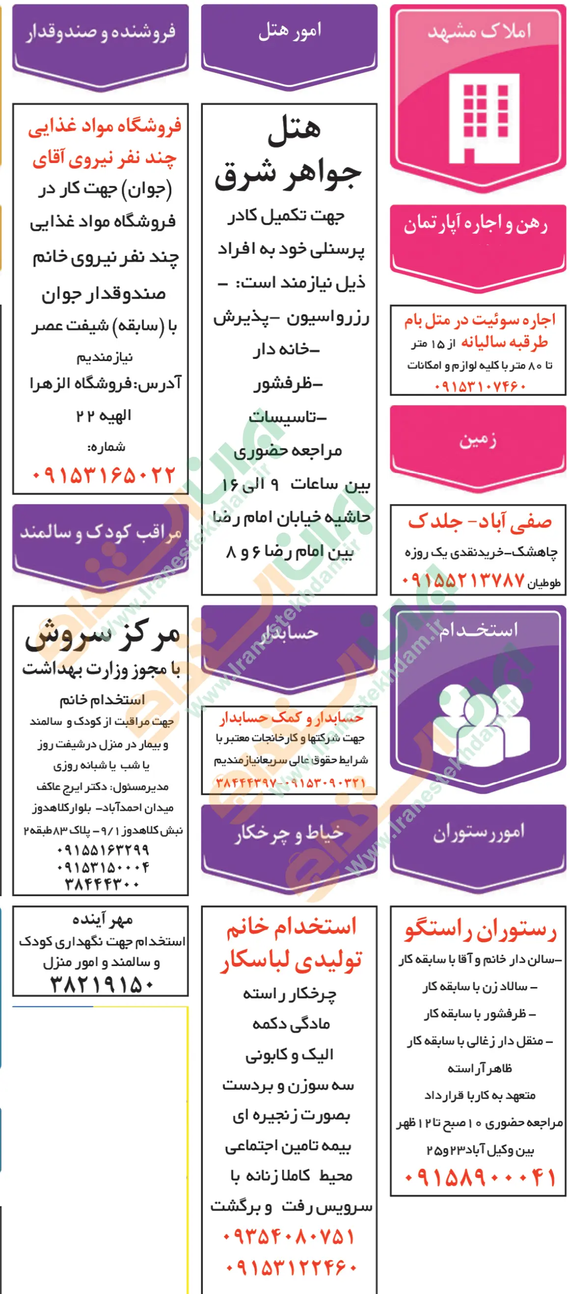 روزنامه استخدامی استان خراسان رضوی و شهر مشهد | دوشنبه 29 دی 1404