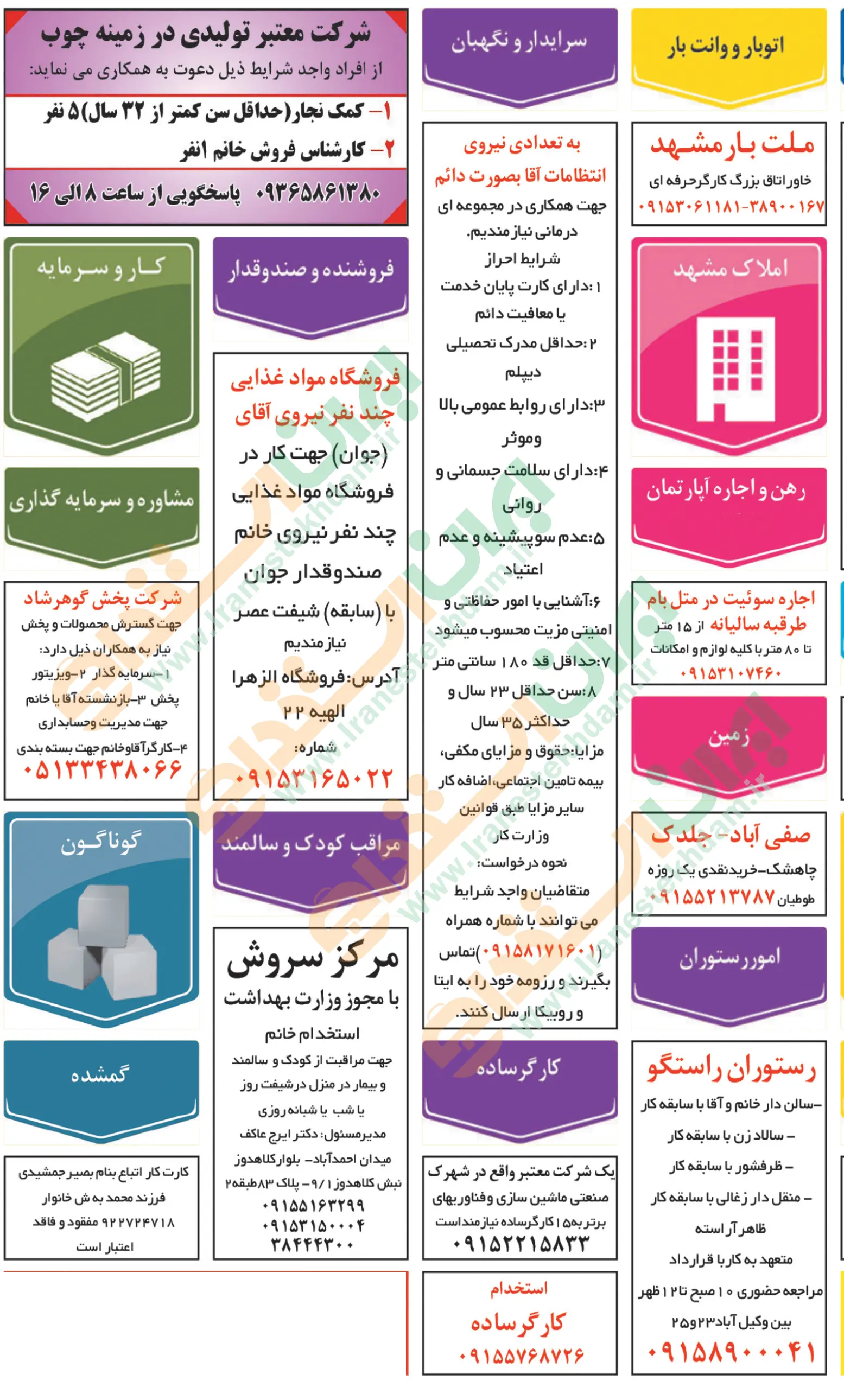 ♦ در صورتی که به دنبال موقعیت های شغلی روز مشهد هستید، میتوانید از طریق سایت ایران استخدام از یکی از روش های دریافت آگهی های استخدامی “از طریق ایمیل و پیامک – از طریق اپلیکیشن اختصاصی ایران استخدام – از طریق کانال تلگرام ایران استخدام” اقدام نمایید.