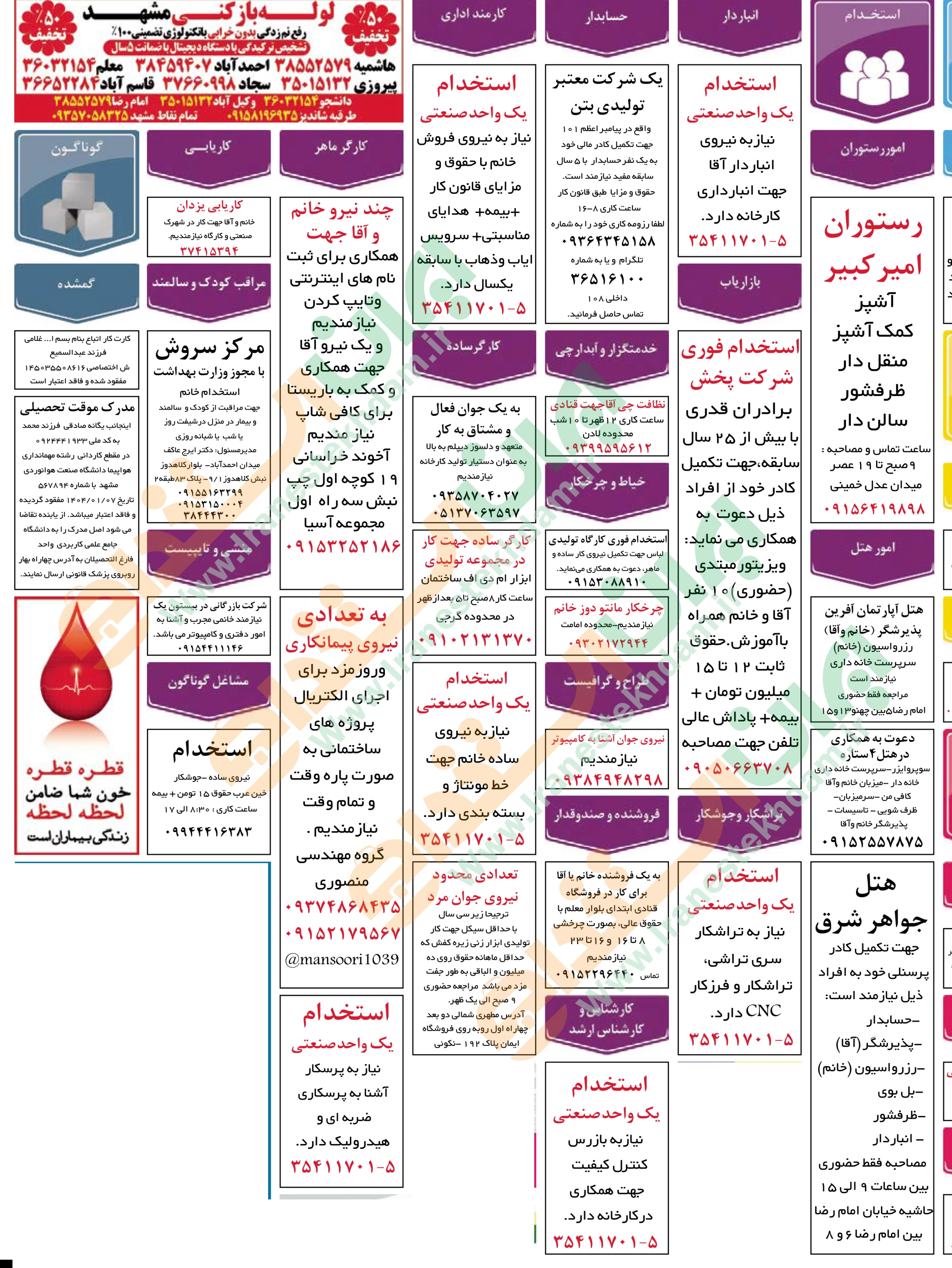 روزنامه استخدامی استان خراسان رضوی و شهر مشهد | چهارشنبه 31 اردیبهشت 1404