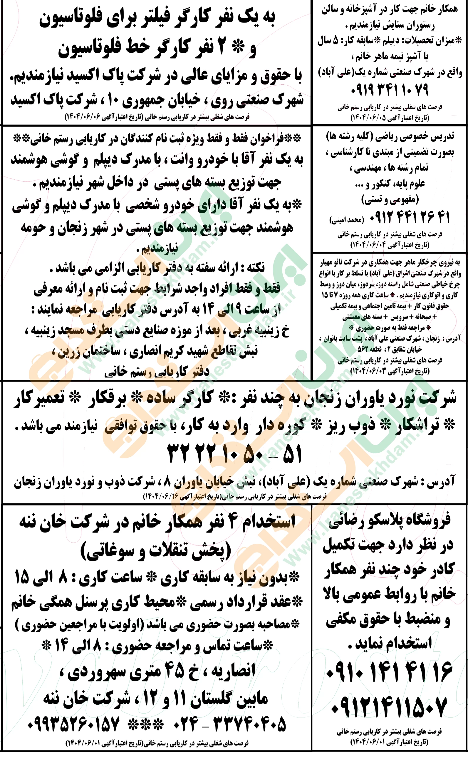 روزنامه استخدامی استان زنجان | شنبه 1 شهریور 1404