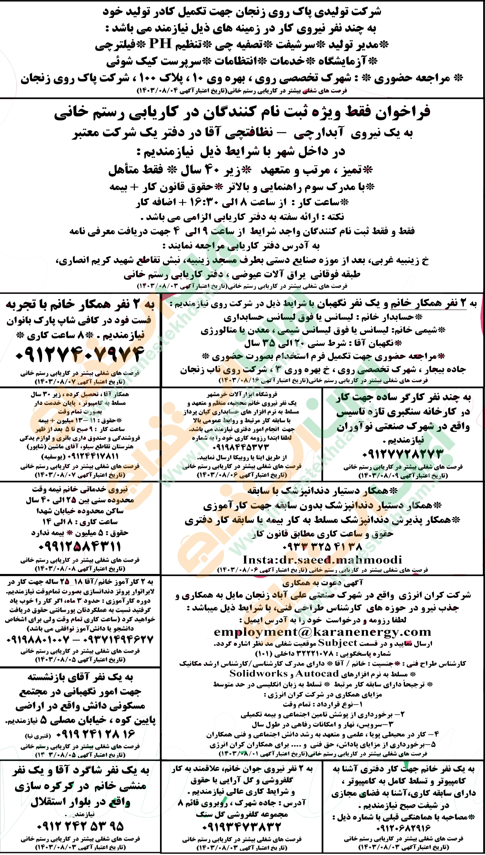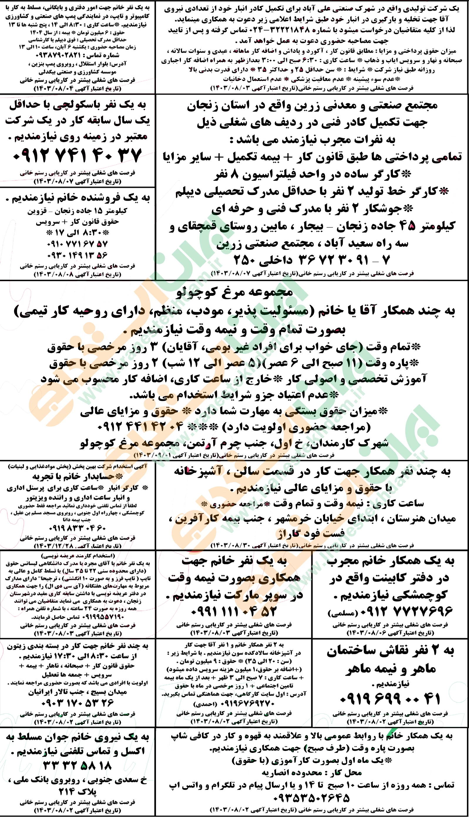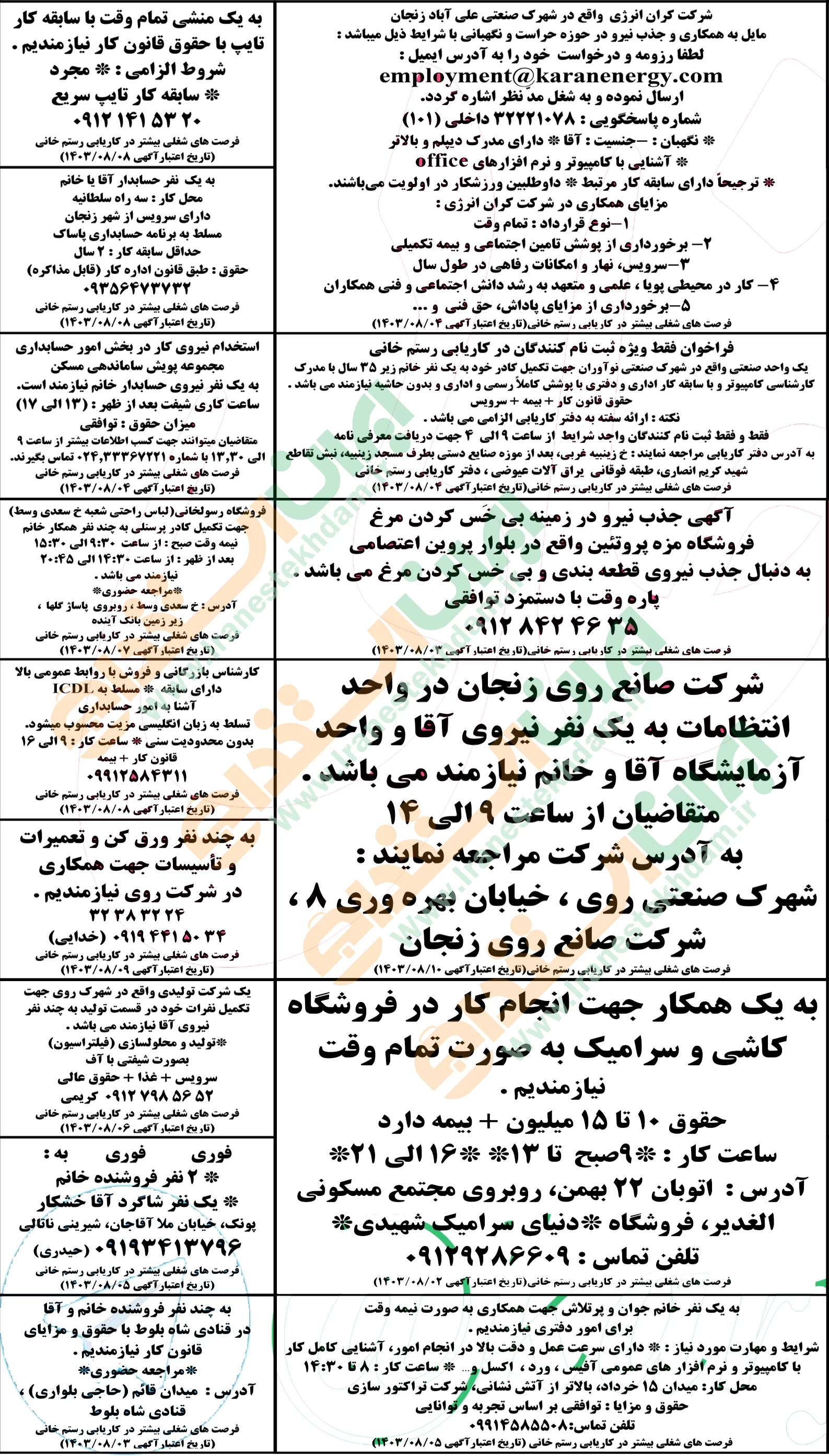 روزنامه استخدامی استان زنجان | چهارشنبه 2 آبان 1403