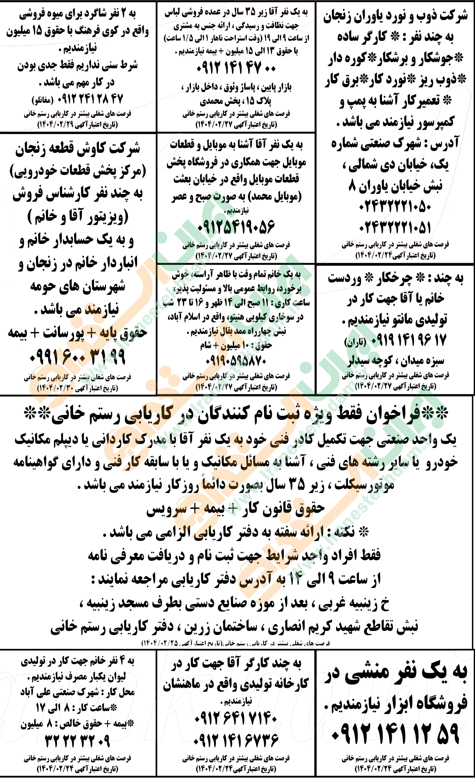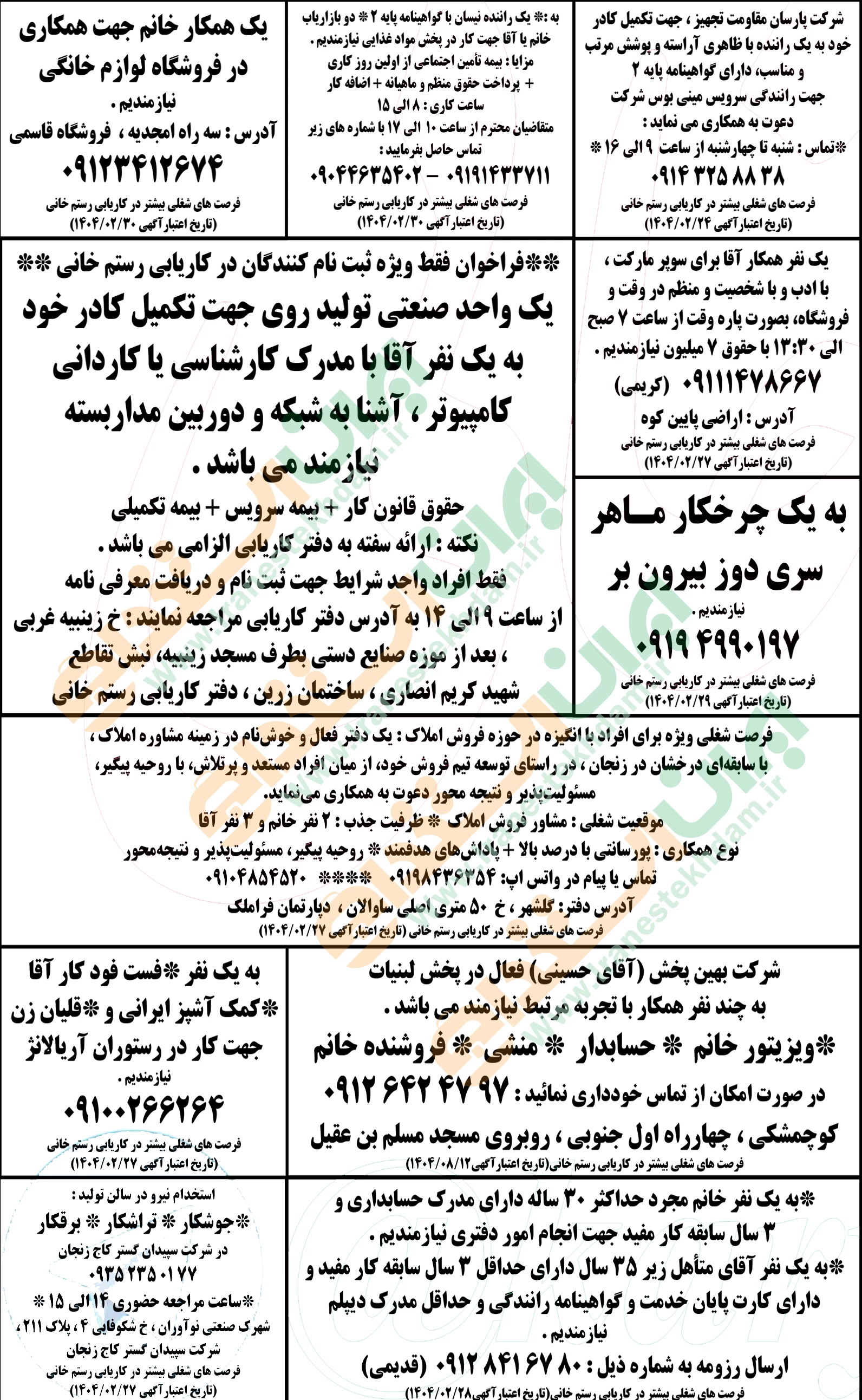 روزنامه استخدامی استان زنجان | چهارشنبه 24 اردیبهشت 1404