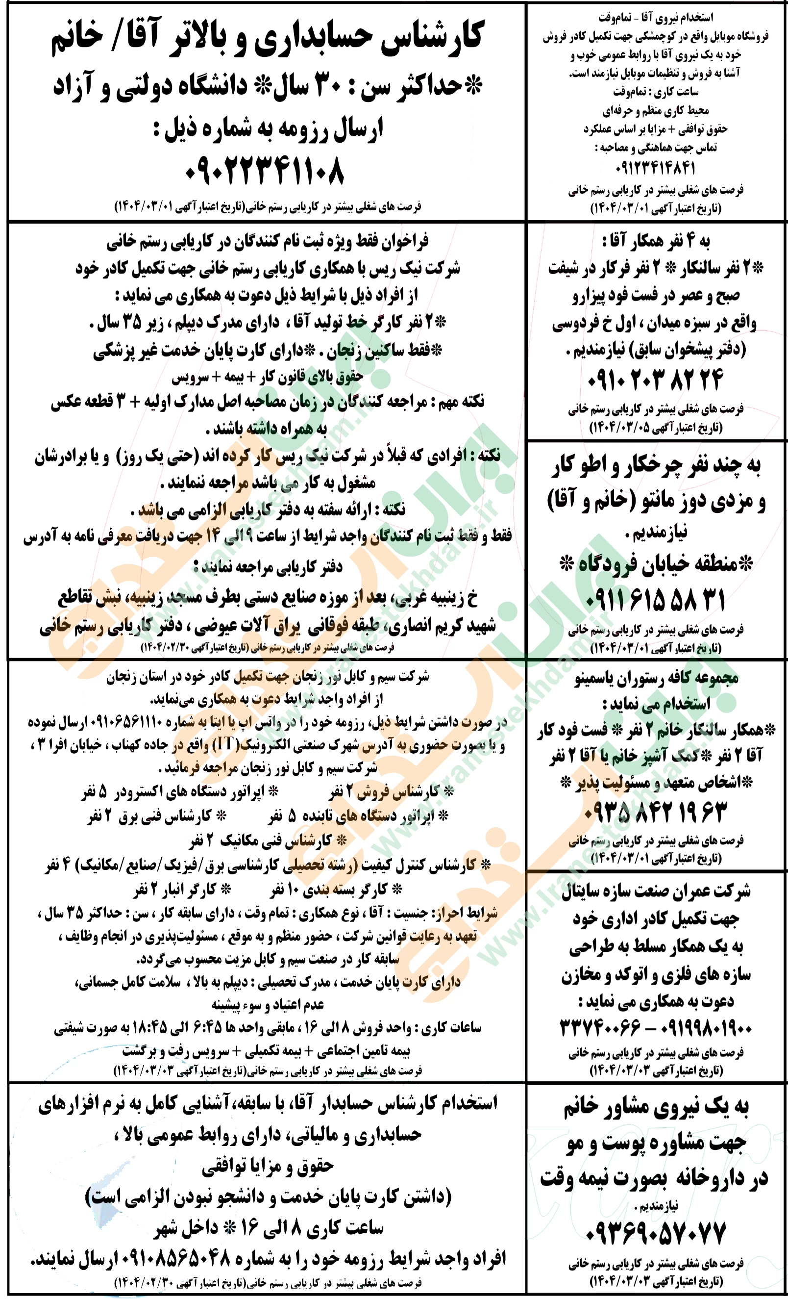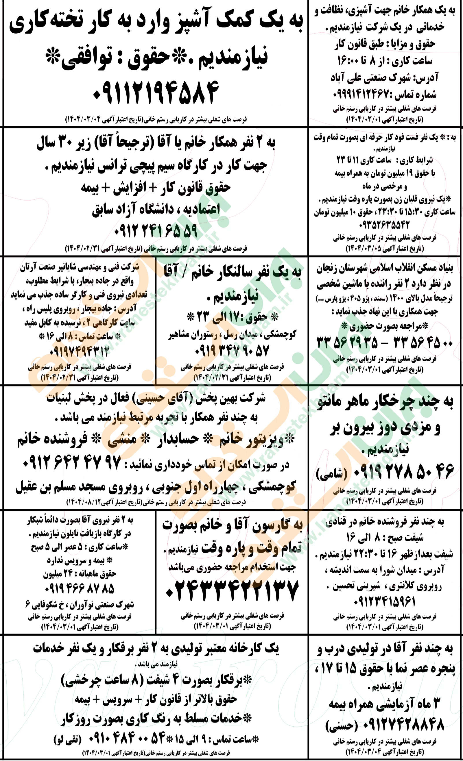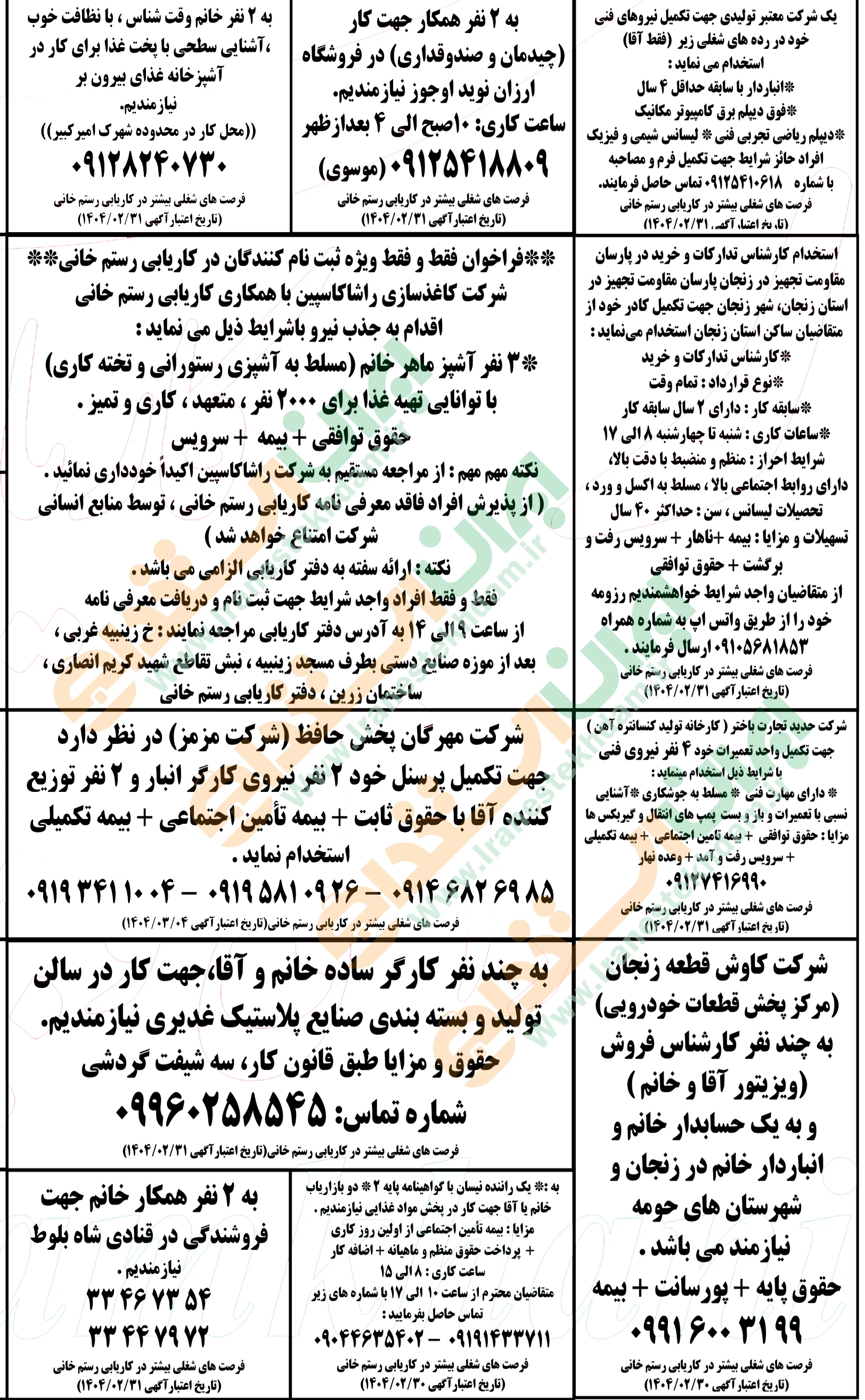 روزنامه استخدامی استان زنجان | سه شنبه 30 اردیبهشت 1404