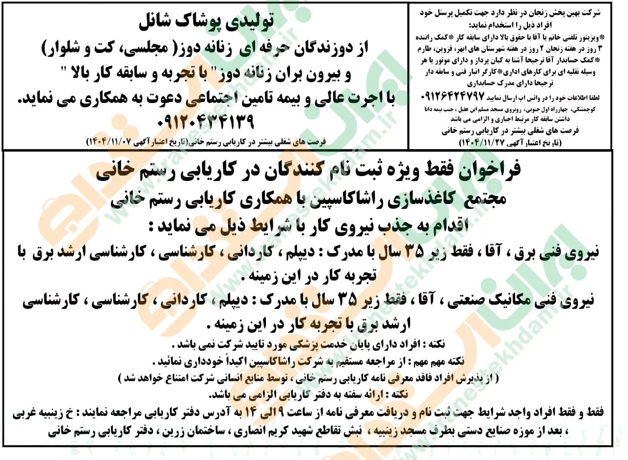 روزنامه استخدامی استان زنجان | دوشنبه ۶ بهمن ۱۴۰۴