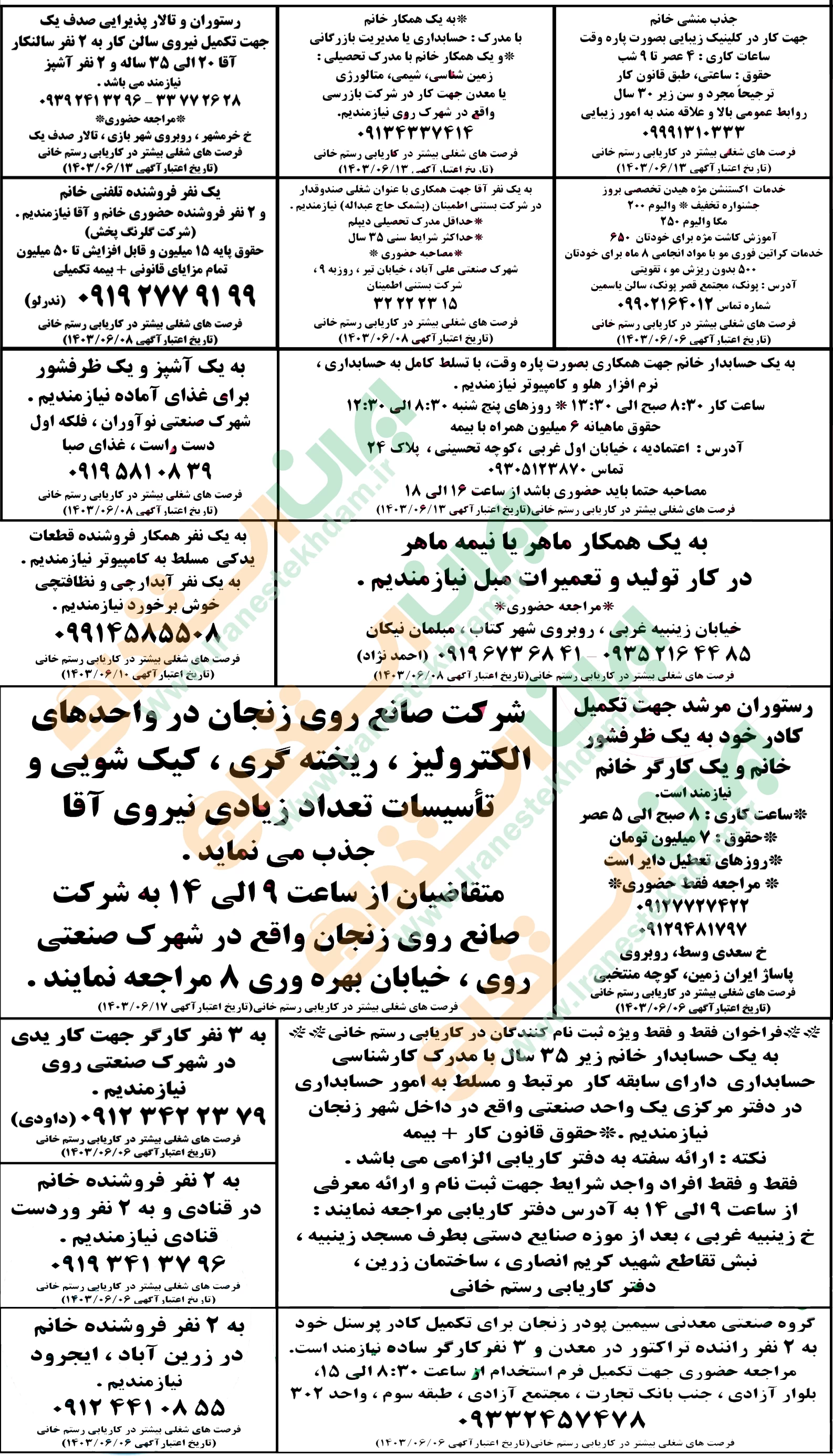روزنامه استخدامی استان زنجان | سه شنبه ۶ شهریور ۱۴۰۳
