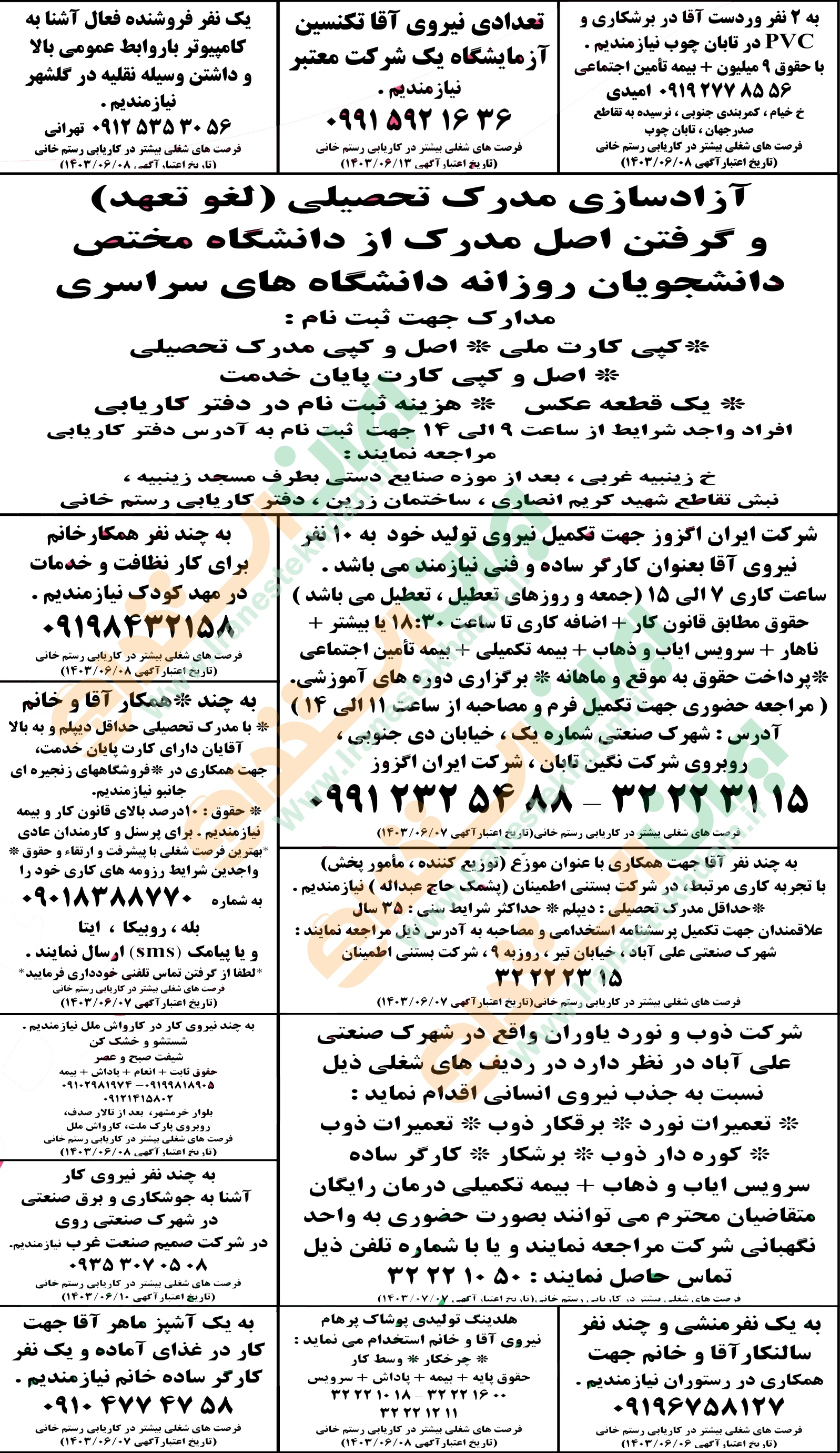 روزنامه استخدامی استان زنجان | سه شنبه 6 شهریور 1403