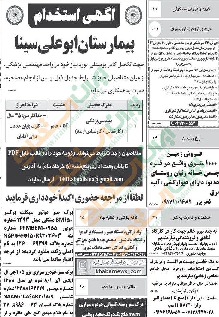 روزنامه استخدامی فارس و شهر شیراز | یکشنبه ۱ خرداد ۱۴۰۱