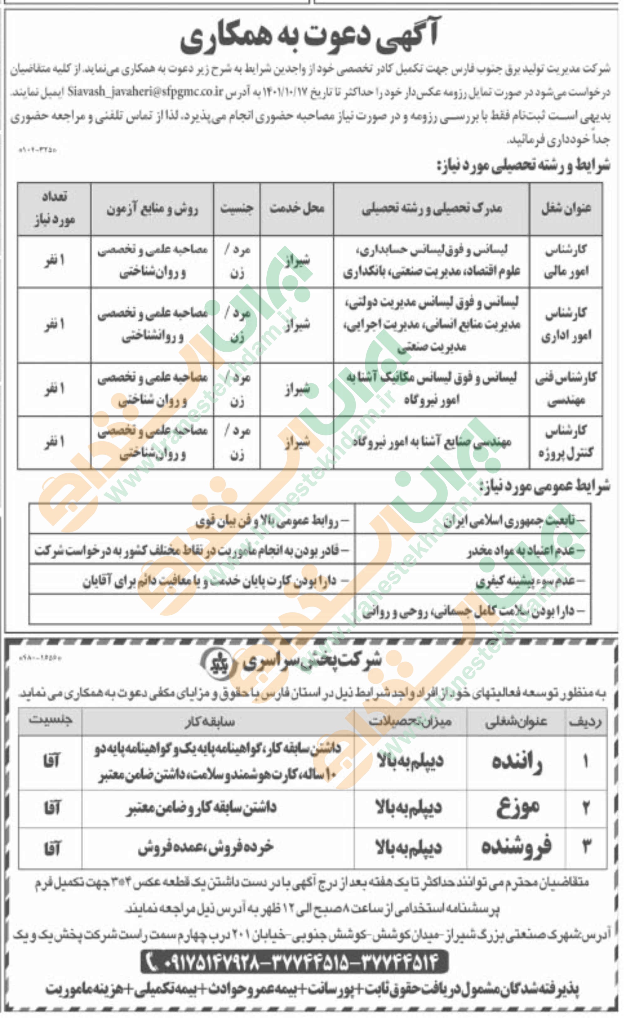 همچنین برای مشاهده صفحه نیازمندی های استخدامی استان فارس اینجا کلیک نمایید