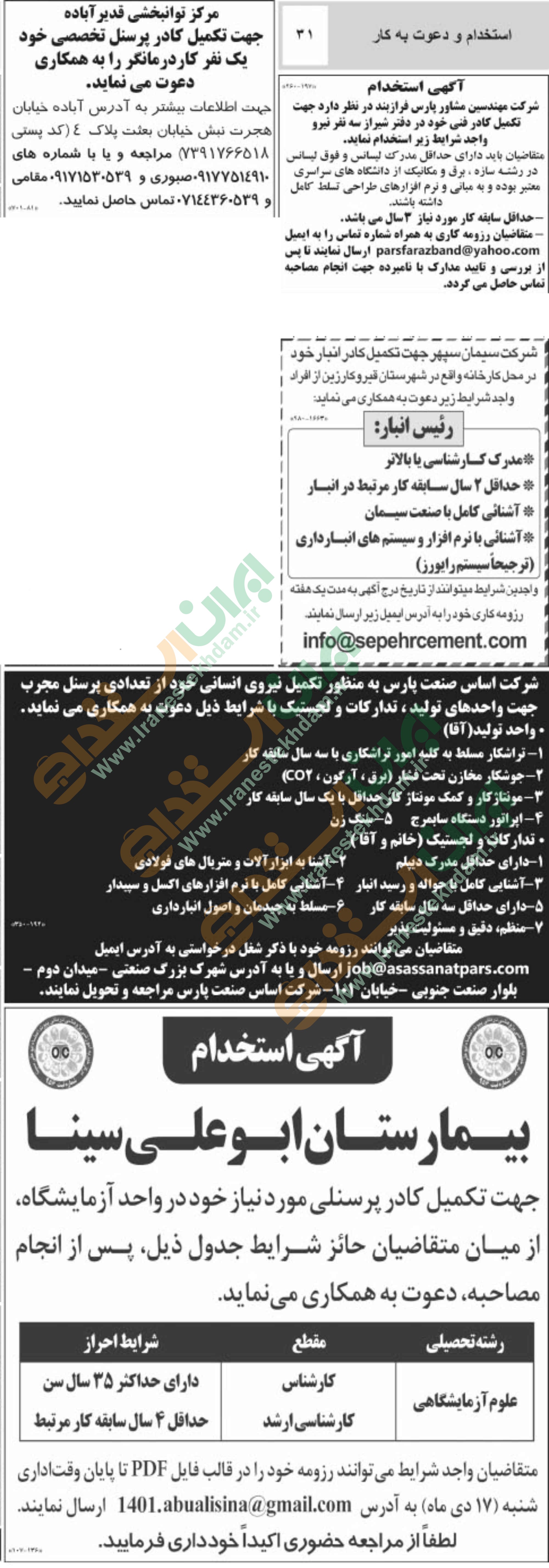 روزنامه استخدامی فارس و شهر شیراز | دوشنبه ۱۲ دی ۱۴۰۱