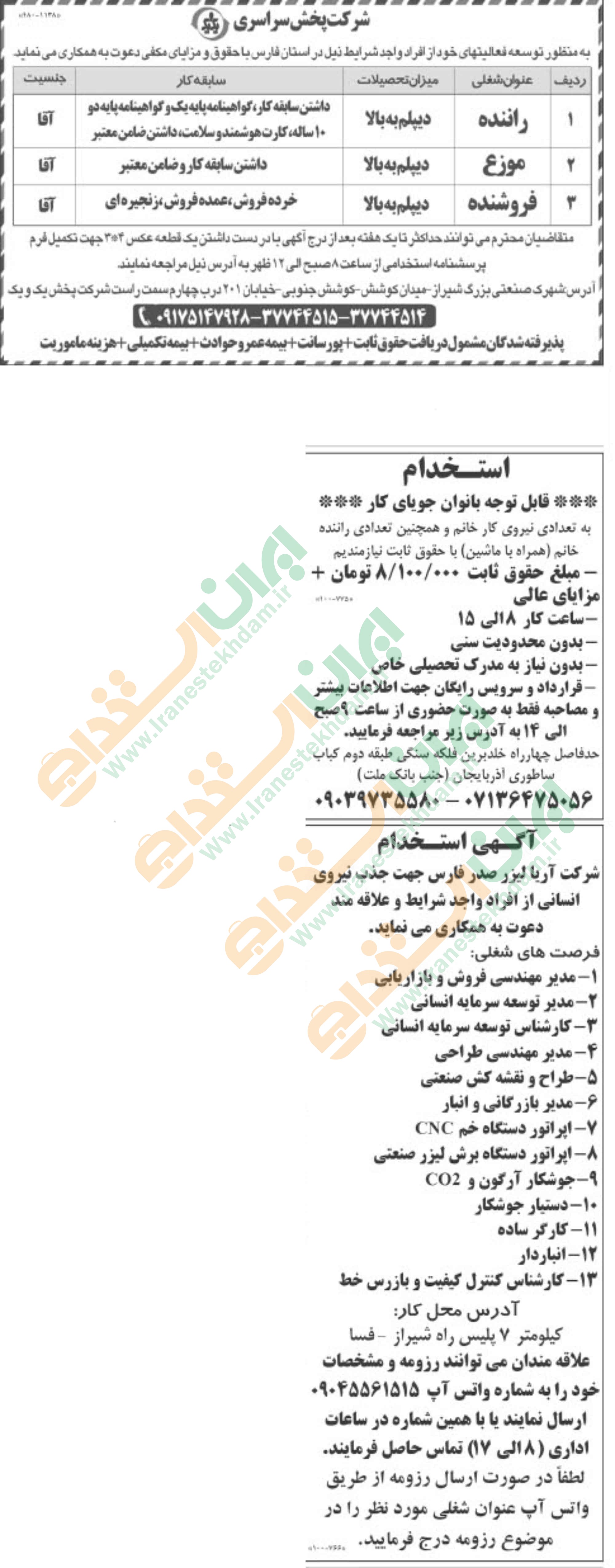 ♦ در صورتی که به دنبال موقعیت های شغلی روز فارس هستید، میتوانید از طریق سایت ایران استخدام از یکی از روش های دریافت آگهی های استخدامی “از طریق ایمیل و پیامک – از طریق اپلیکیشن اختصاصی ایران استخدام – از طریق کانال تلگرام ایران استخدام” اقدام نمایید.