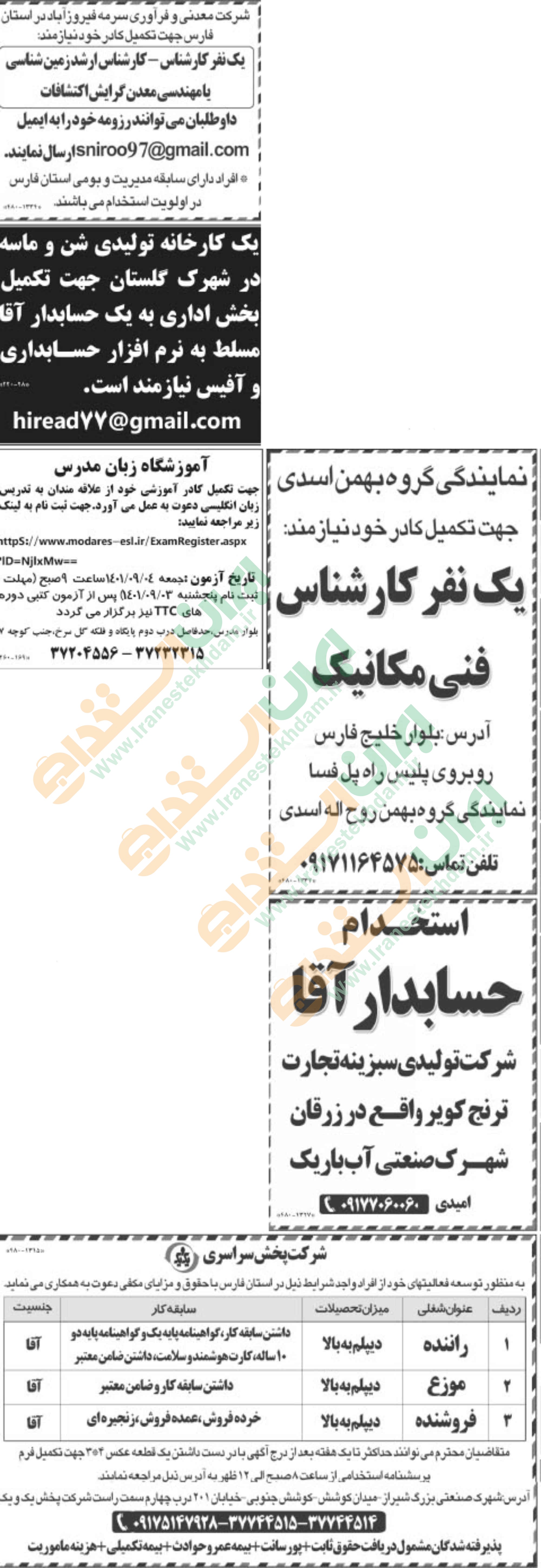 روزنامه استخدامی فارس و شهر شیراز | شنبه ۱۴ آبان ۱۴۰۱