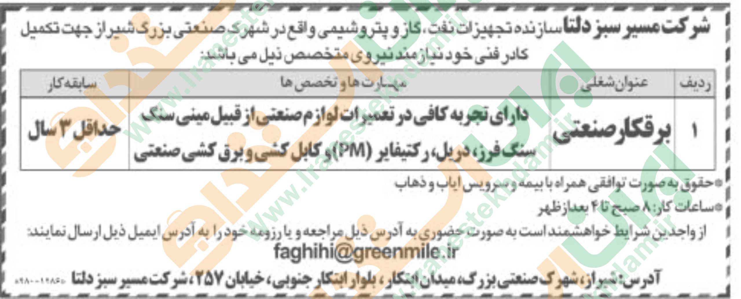 ♦ در صورتی که به دنبال موقعیت های شغلی روز فارس هستید، میتوانید از طریق سایت ایران استخدام از یکی از روش های دریافت آگهی های استخدامی “از طریق ایمیل و پیامک – از طریق اپلیکیشن اختصاصی ایران استخدام – از طریق کانال تلگرام ایران استخدام” اقدام نمایید.