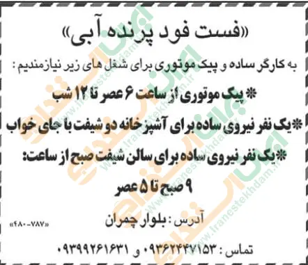 ♦ در صورتی که به دنبال موقعیت های شغلی روز فارس هستید، میتوانید از طریق سایت ایران استخدام از یکی از روش های دریافت آگهی های استخدامی “از طریق ایمیل و پیامک – از طریق اپلیکیشن اختصاصی ایران استخدام – از طریق کانال تلگرام ایران استخدام” اقدام نمایید.