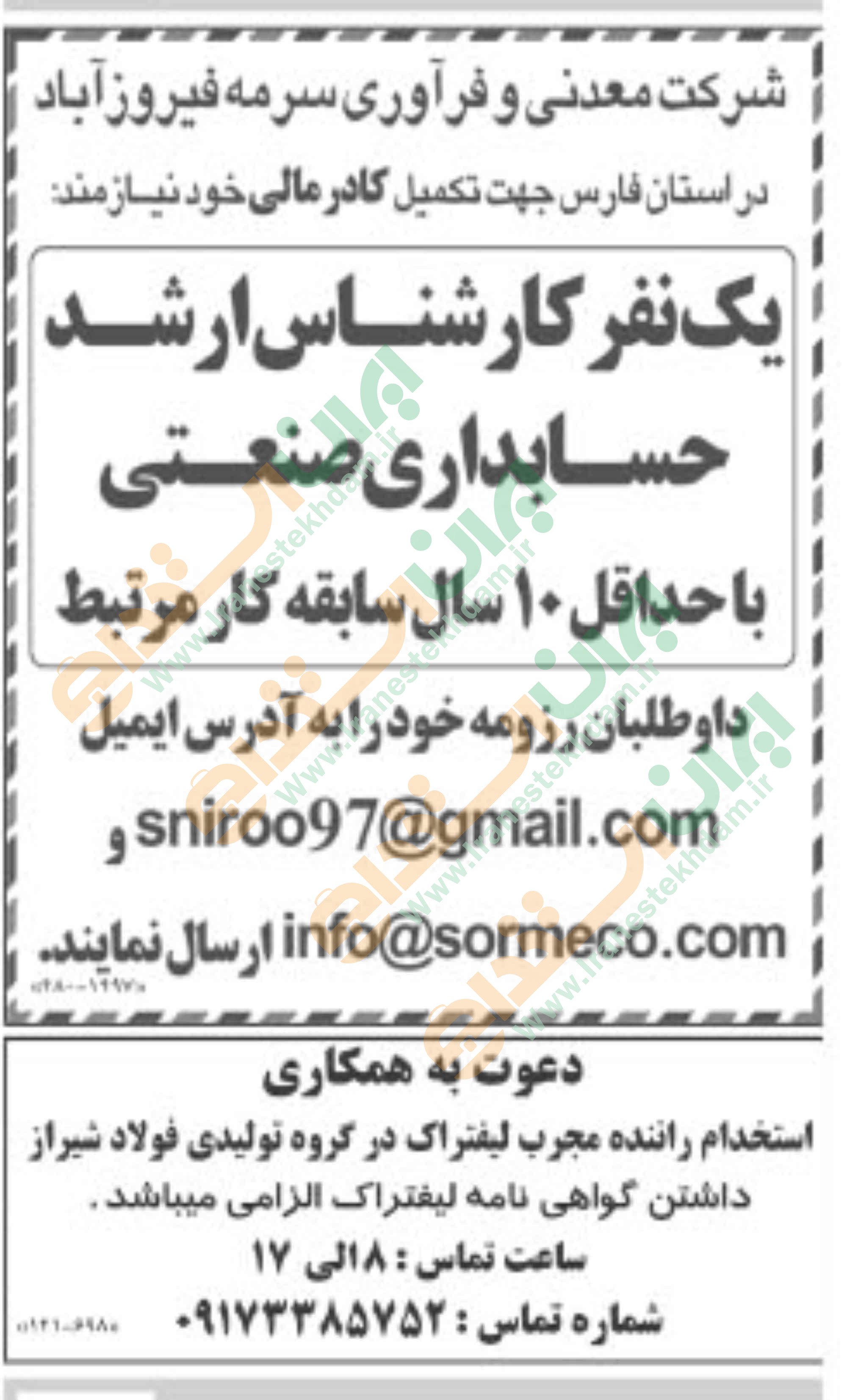 ♦ در صورتی که به دنبال موقعیت های شغلی روز فارس هستید، میتوانید از طریق سایت ایران استخدام از یکی از روش های دریافت آگهی های استخدامی “از طریق ایمیل و پیامک – از طریق اپلیکیشن اختصاصی ایران استخدام – از طریق کانال تلگرام ایران استخدام” اقدام نمایید.