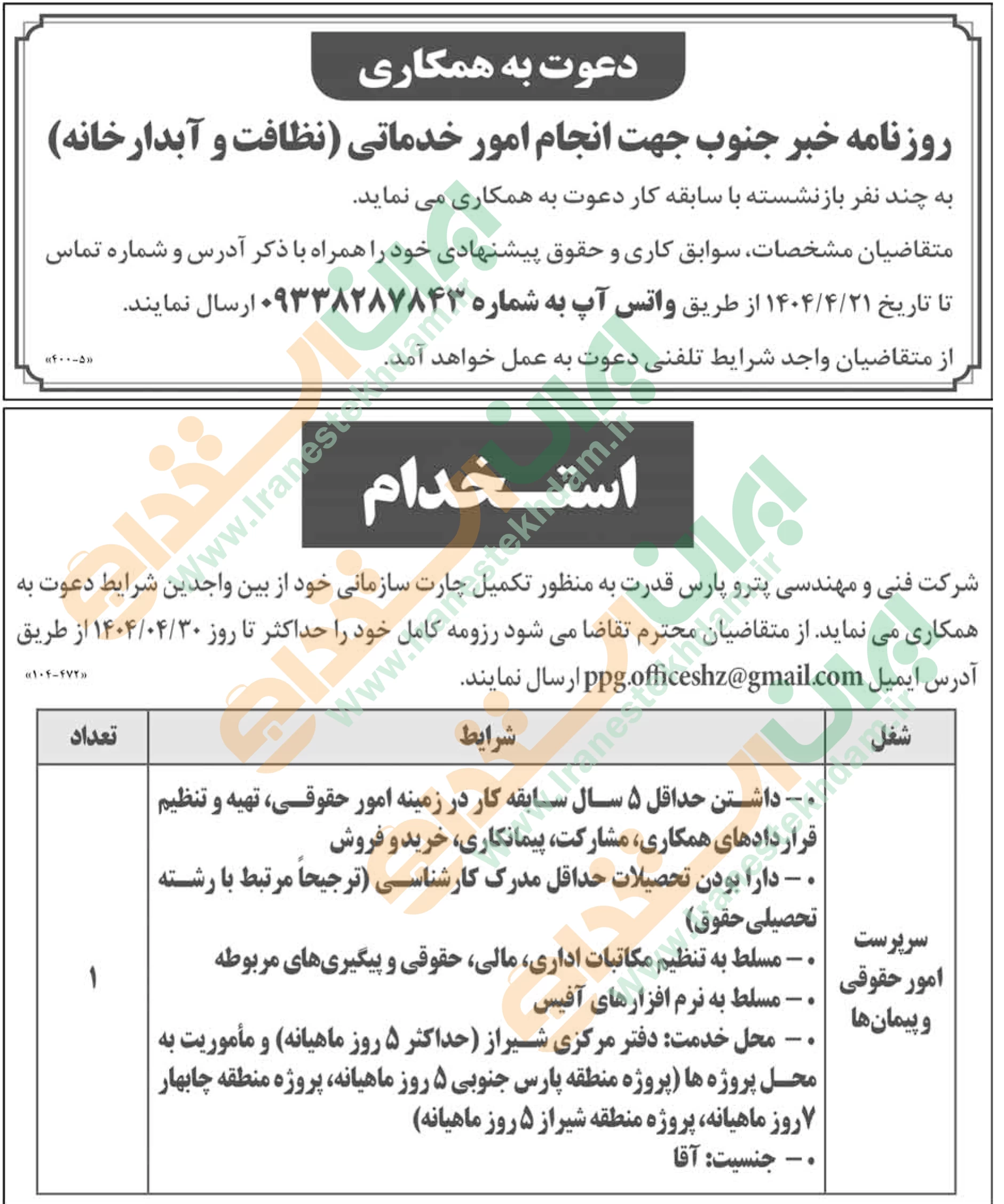 روزنامه استخدامی فارس و شهر شیراز | دوشنبه ۱۶ تیر ۱۴۰۴
