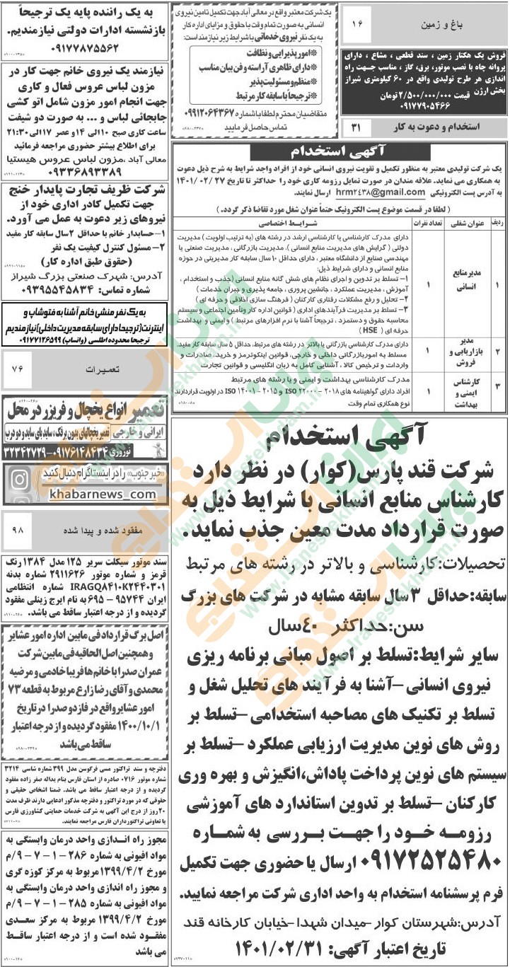 روزنامه استخدامی فارس و شهر شیراز | شنبه ۱۷ اردیبهشت ۱۴۰۱