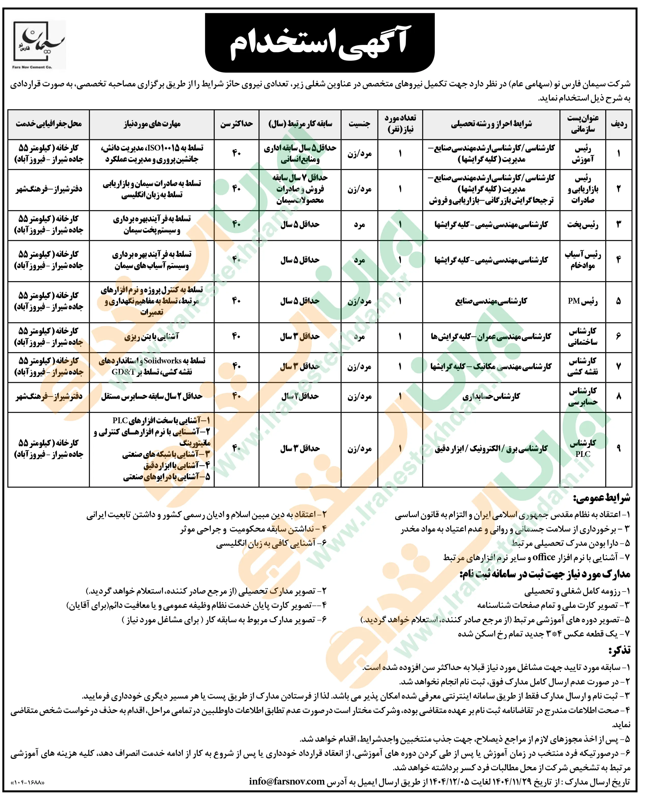 همچنین برای مشاهده صفحه نیازمندی های استخدامی استان فارس اینجا کلیک نمایید