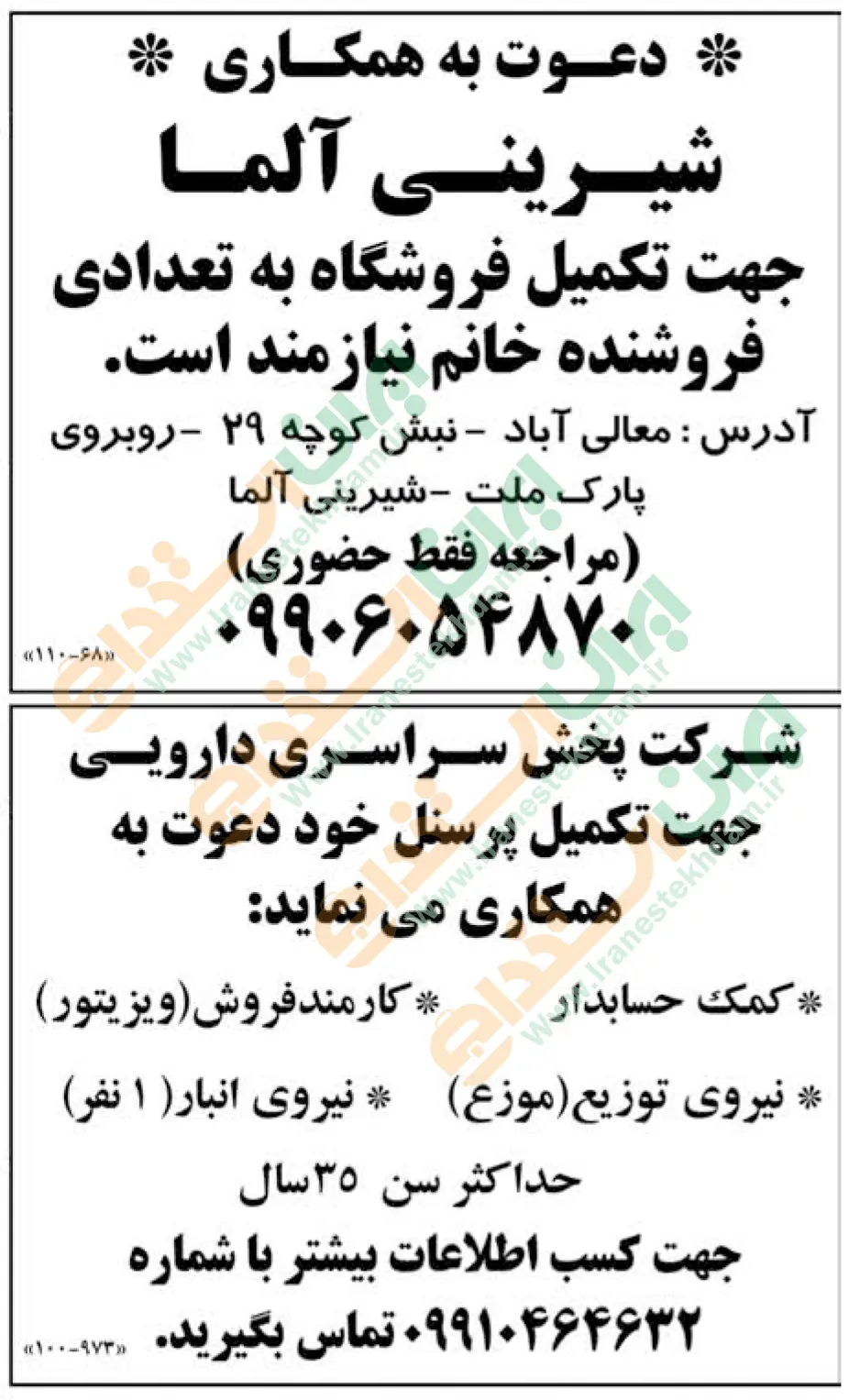 ♦ در صورتی که به دنبال موقعیت های شغلی روز فارس هستید، میتوانید از طریق سایت ایران استخدام از یکی از روش های دریافت آگهی های استخدامی “از طریق ایمیل و پیامک – از طریق اپلیکیشن اختصاصی ایران استخدام – از طریق کانال تلگرام ایران استخدام” اقدام نمایید.