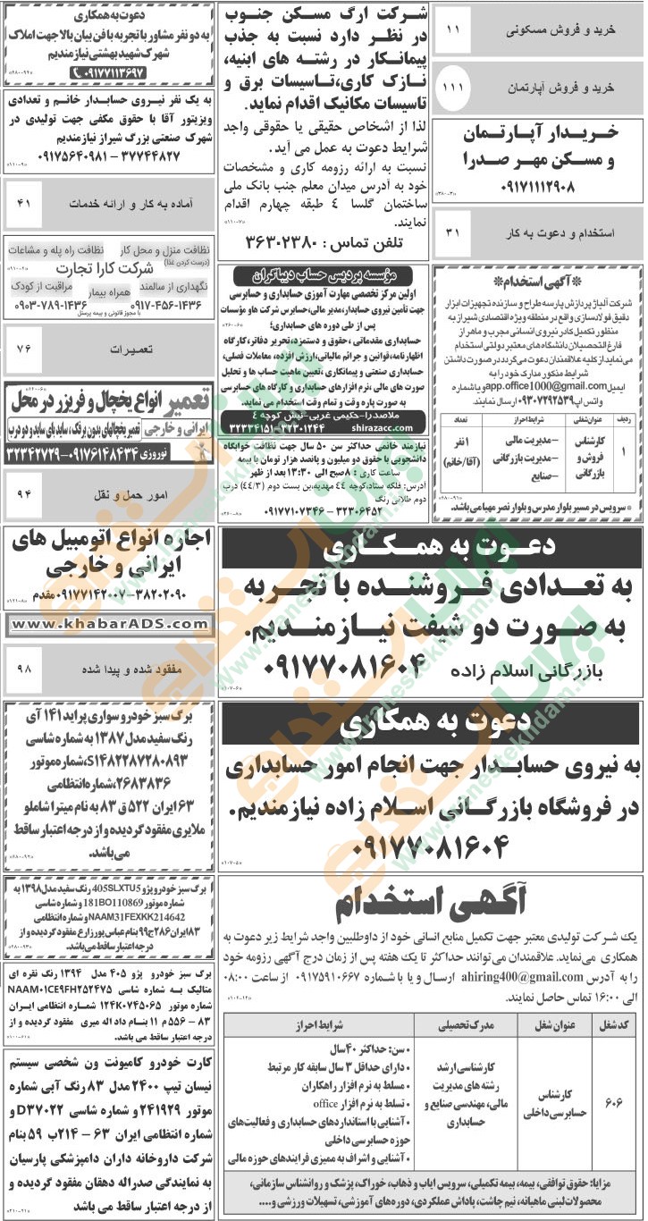 روزنامه استخدامی فارس و شهر شیراز | سه شنبه ۲۳ فروردین ۱۴۰۱