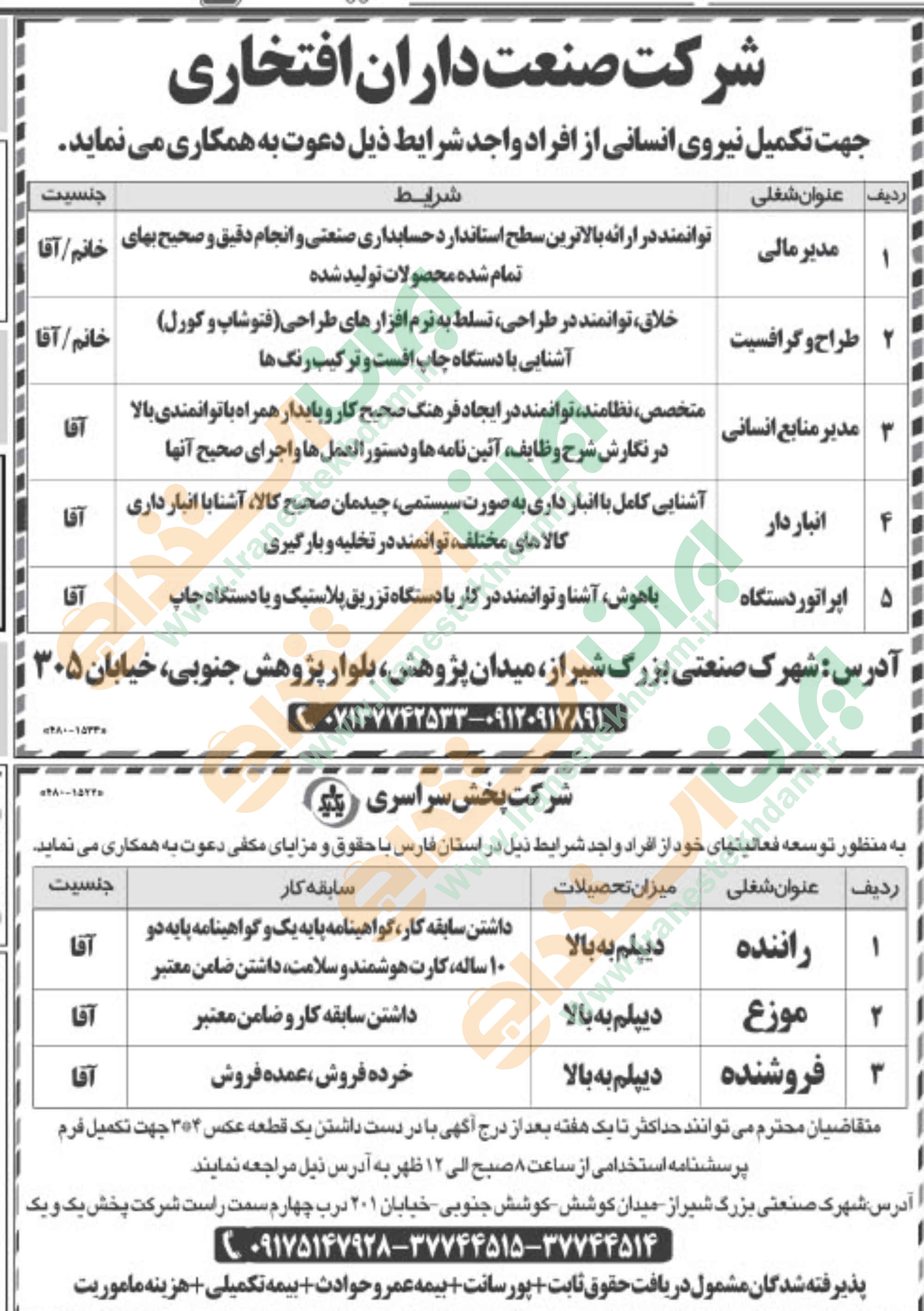 همچنین برای مشاهده صفحه نیازمندی های استخدامی استان فارس اینجا کلیک نمایید