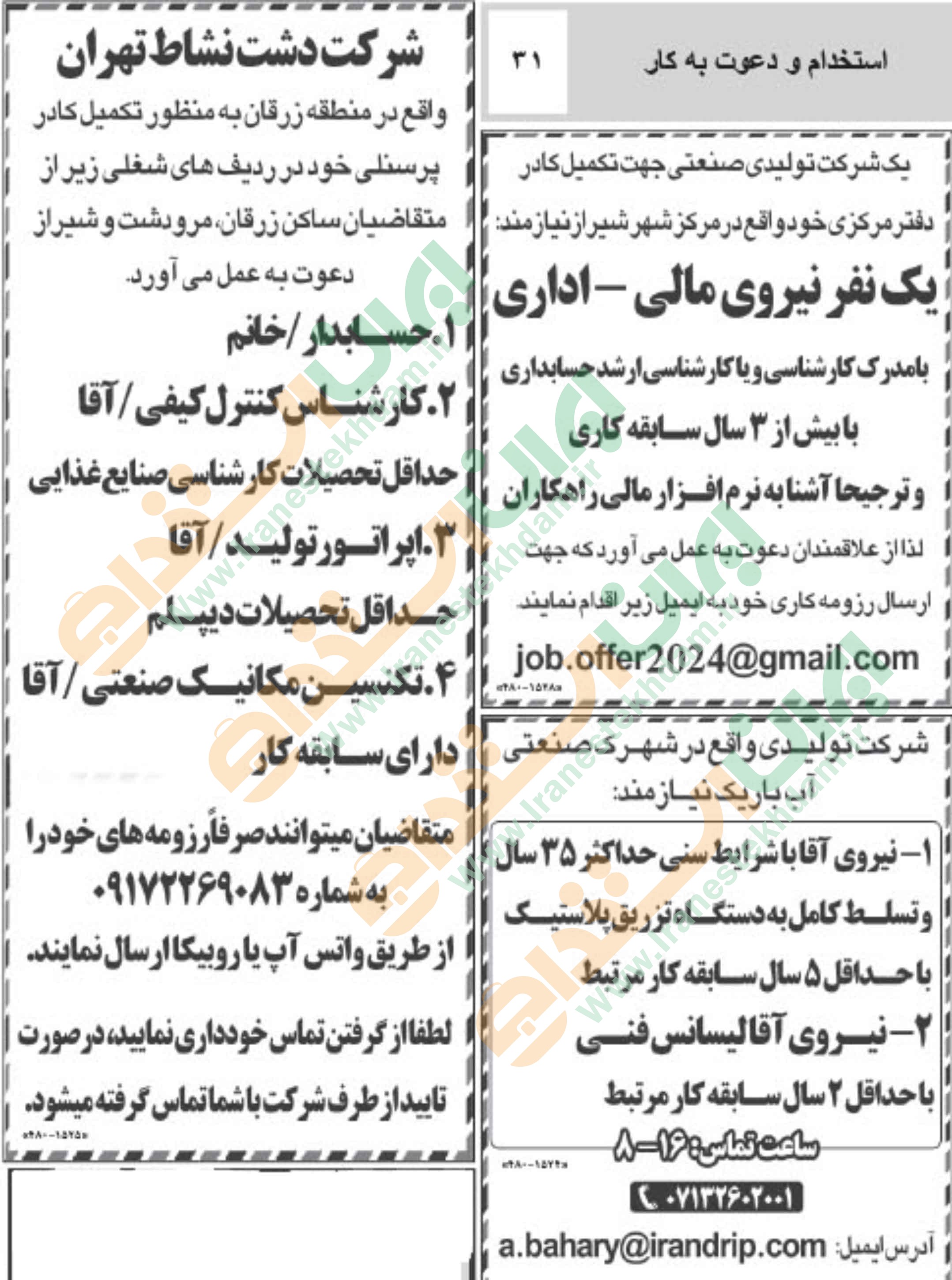 ♦ در صورتی که به دنبال موقعیت های شغلی روز فارس هستید، میتوانید از طریق سایت ایران استخدام از یکی از روش های دریافت آگهی های استخدامی “از طریق ایمیل و پیامک – از طریق اپلیکیشن اختصاصی ایران استخدام – از طریق کانال تلگرام ایران استخدام” اقدام نمایید.