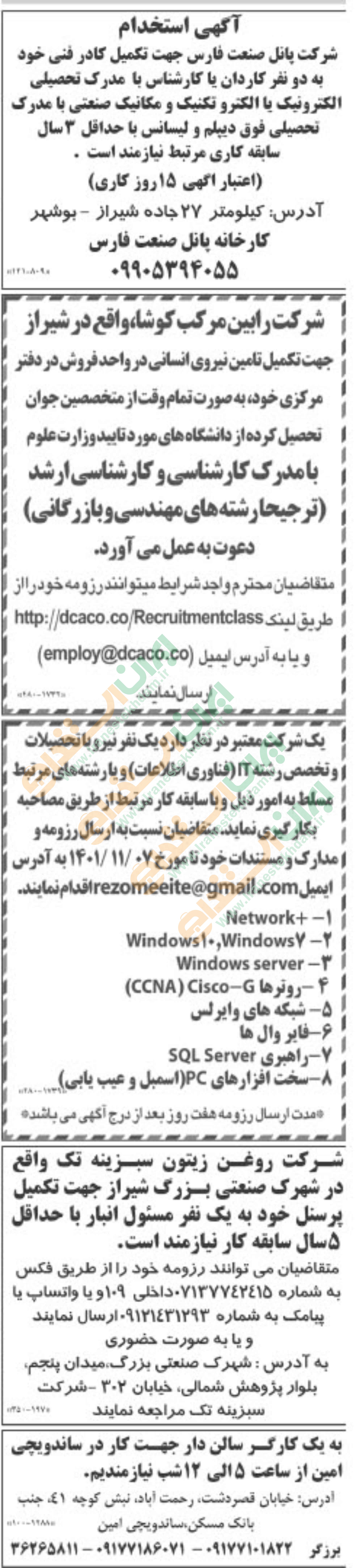 روزنامه استخدامی فارس و شهر شیراز | دوشنبه ۲۶ دی ۱۴۰۱