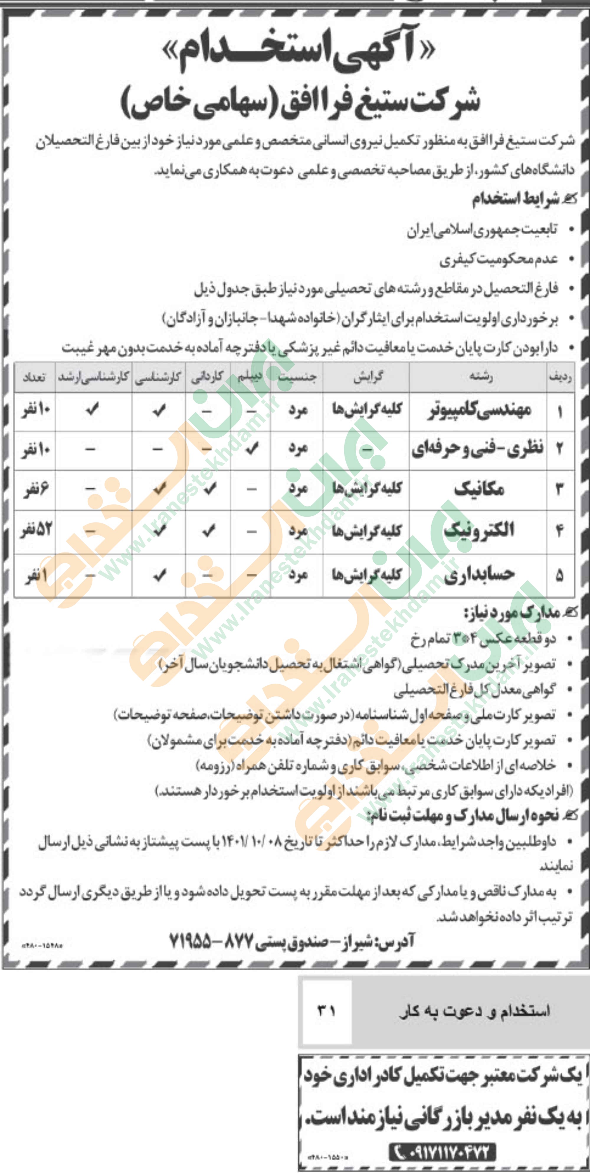 روزنامه استخدامی فارس و شهر شیراز | دوشنبه ۲۸ آذر ۱۴۰۱